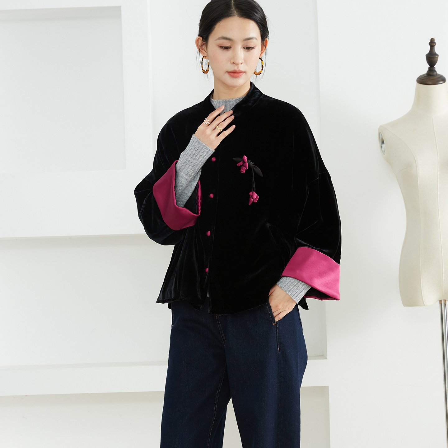 外套开衫 高定 撞色立领国风丝绒真丝挽袖 新中式 宽松 女桑蚕丝长袖
