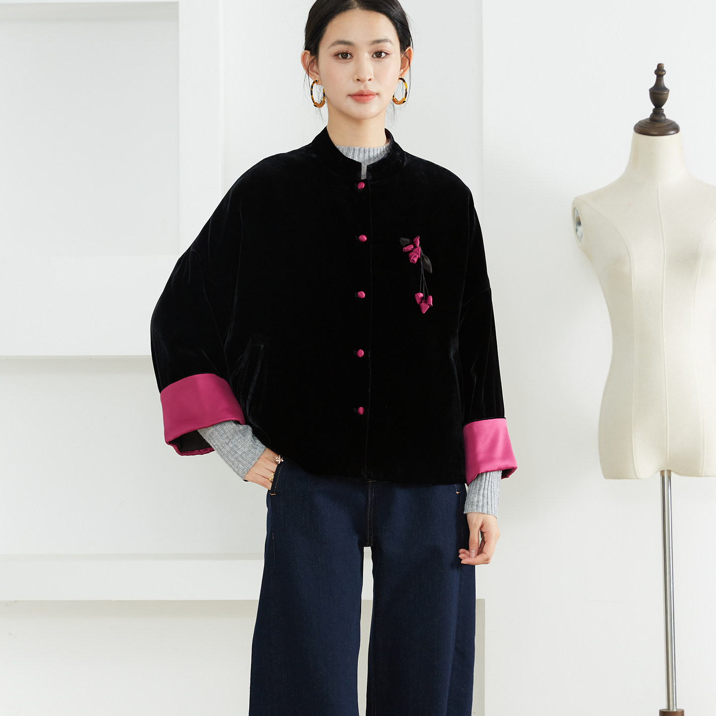 外套开衫 高定 撞色立领国风丝绒真丝挽袖 新中式 宽松 女桑蚕丝长袖由