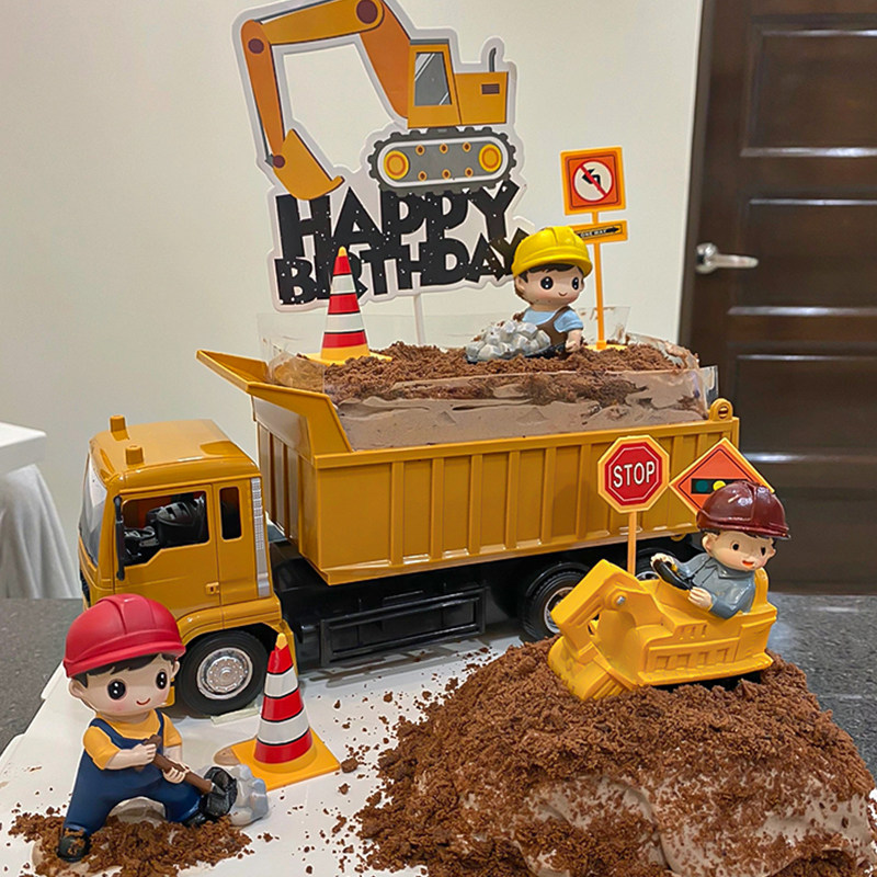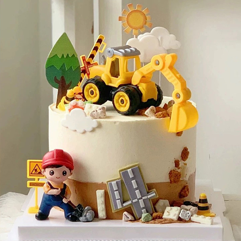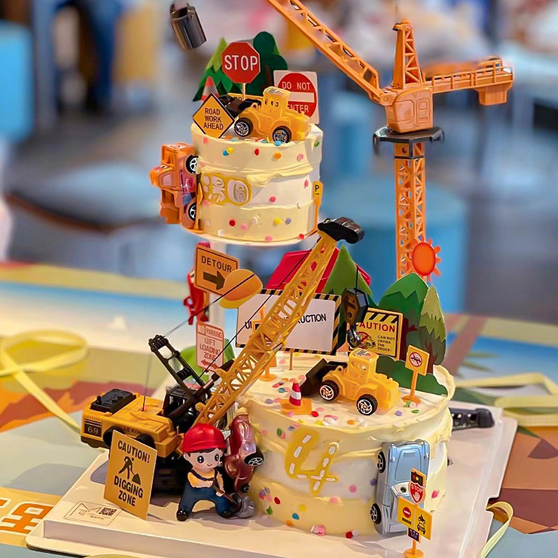 饰施工现场工程队吊机挖掘机路障插件 卡通男宝宝生日工程车蛋糕装由