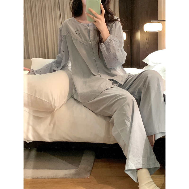 开衫 复古蕾丝花边全棉睡衣女春秋季 2026新款 雾霾蓝长袖 家居服套装由