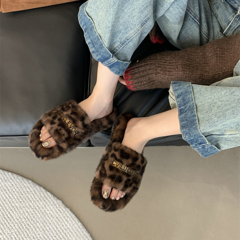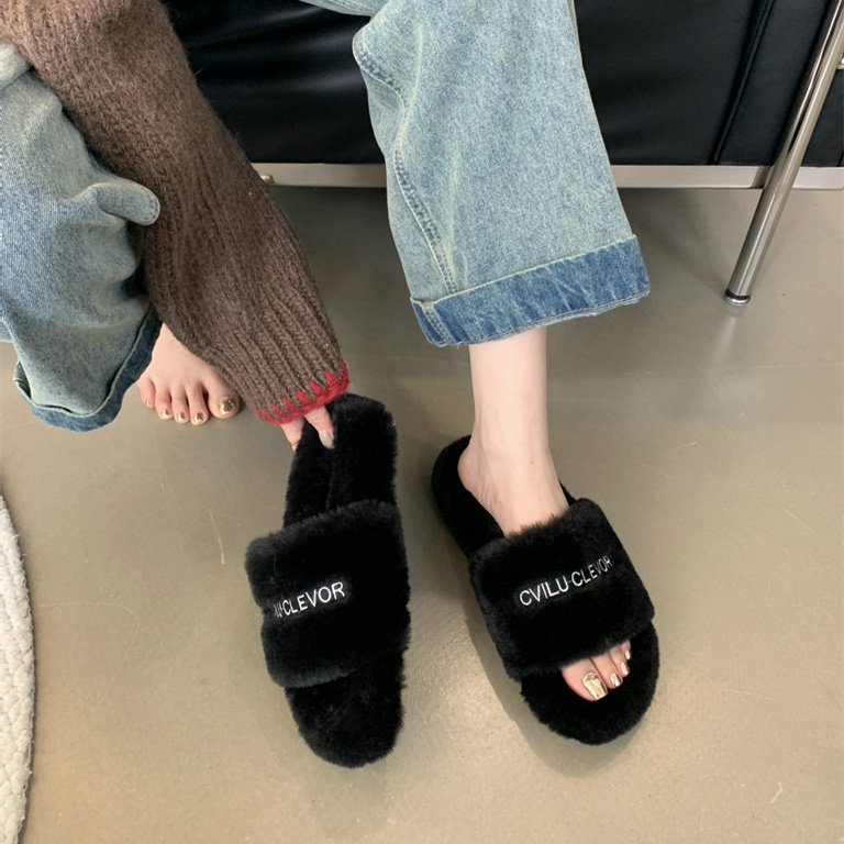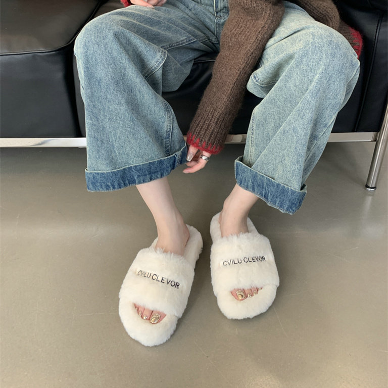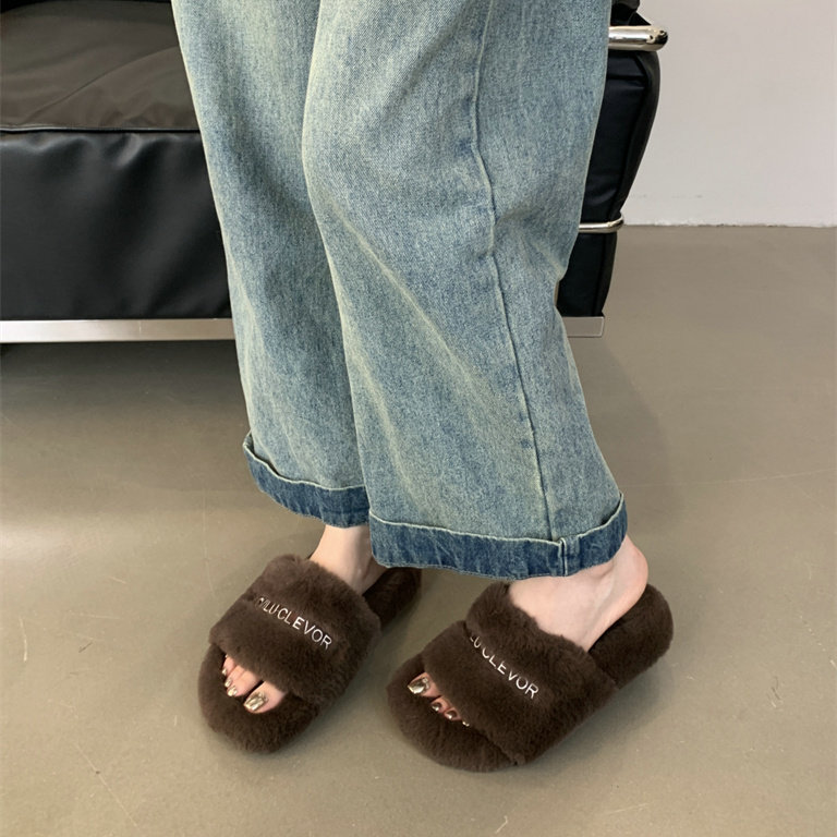 羊羔毛拖鞋 网红外穿加绒超火刺绣字母一脚蹬棉拖 女厚底2025秋冬款