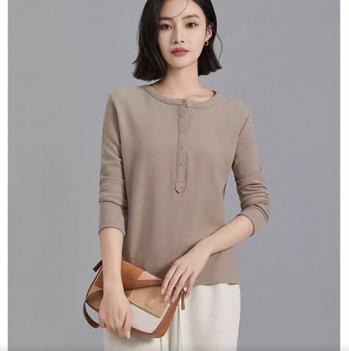 不起球 女上衣内搭长袖 T恤修身 显瘦百搭 春秋柔软半开襟圆领打底衫由
