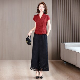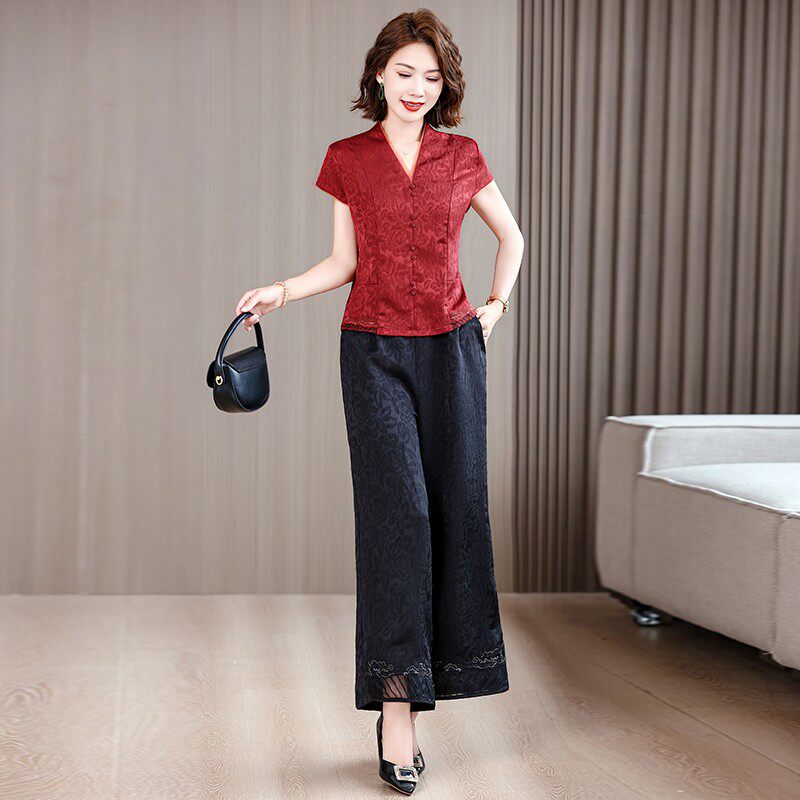 妈妈装 香云纱上衣阔腿裤 桑蚕丝黑色女短袖 真丝套装 两件套夏季 时尚