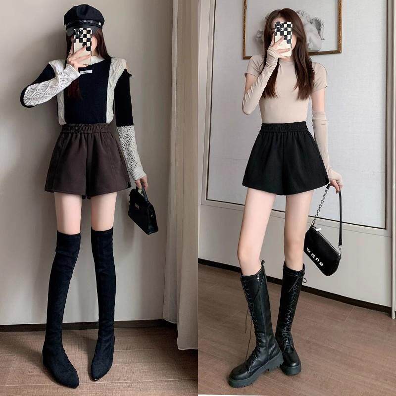 秋冬高腰宽松外穿a字打底休闲阔腿短裤 女2024新款 咖啡色毛呢短裤