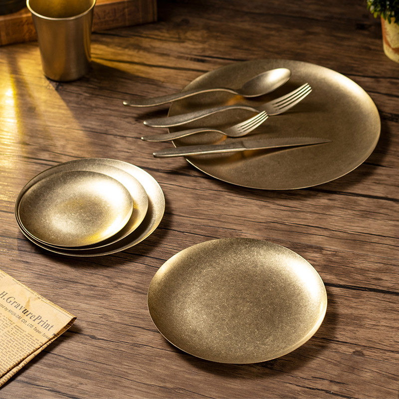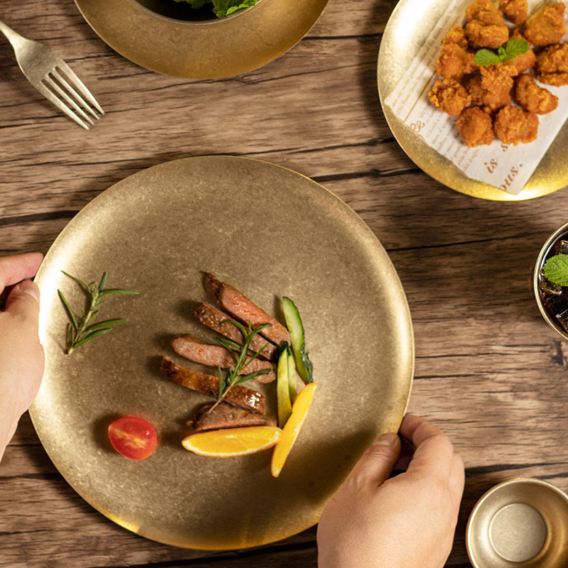 轻奢复古雪金盘子304不锈钢盘金色圆盘浅盘工业风托盘高颜值餐盘