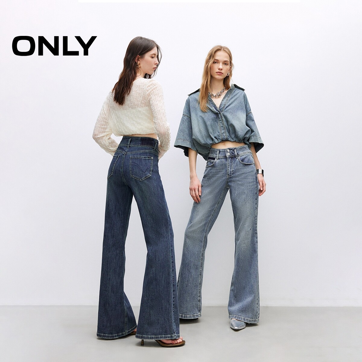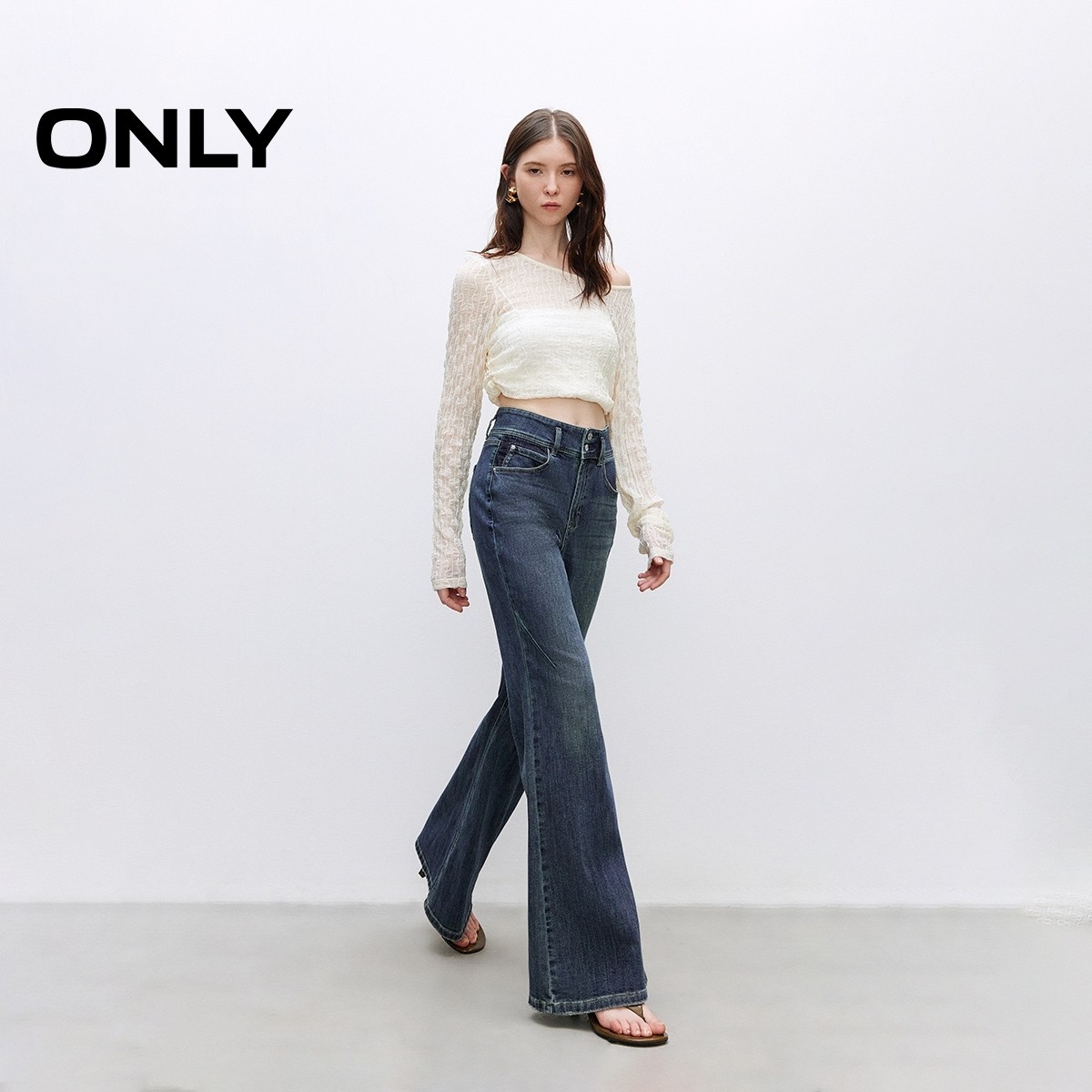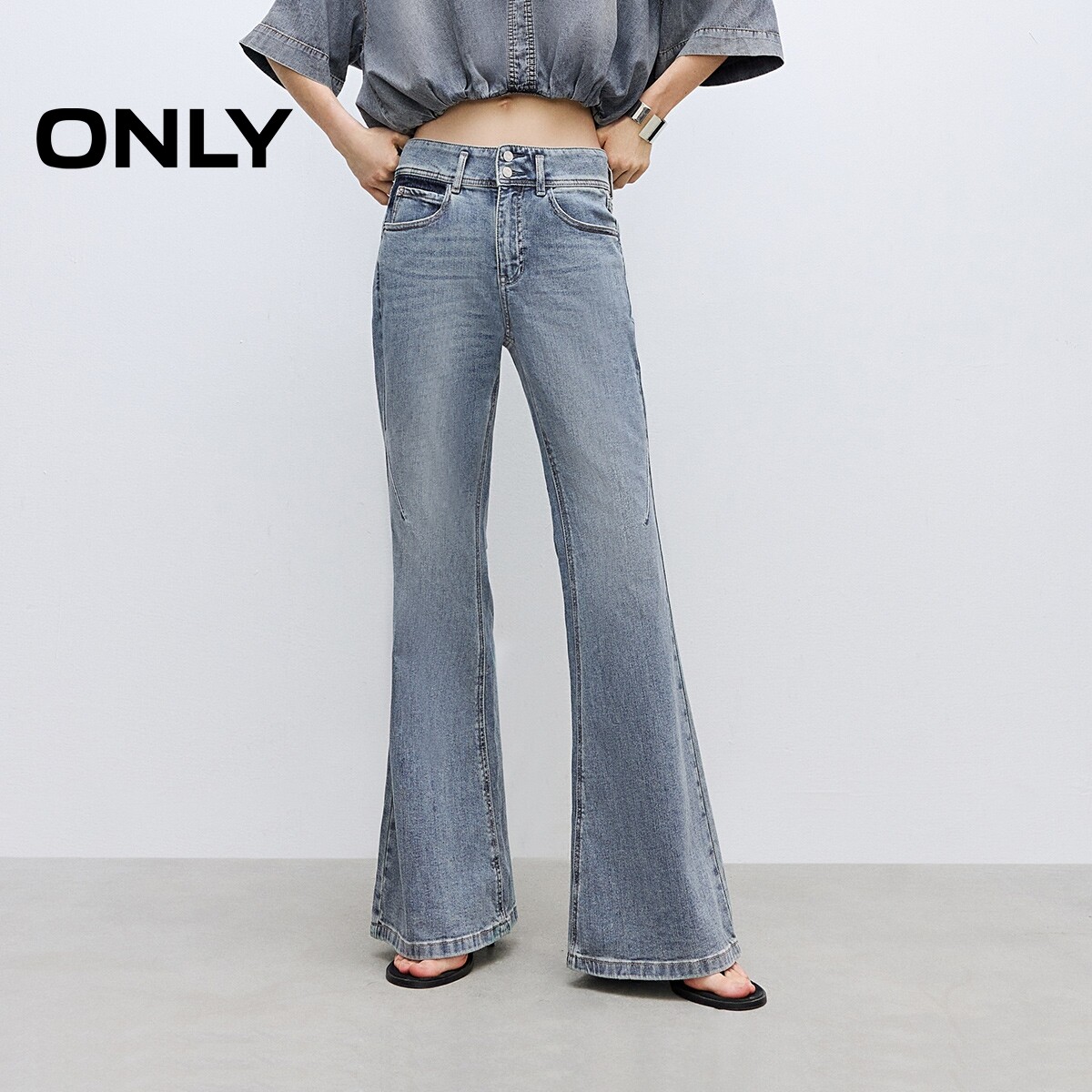 牛仔裤 女 复古腰头做旧水洗高腰显瘦喇叭裤 新款 ONLY奥莱 春季由