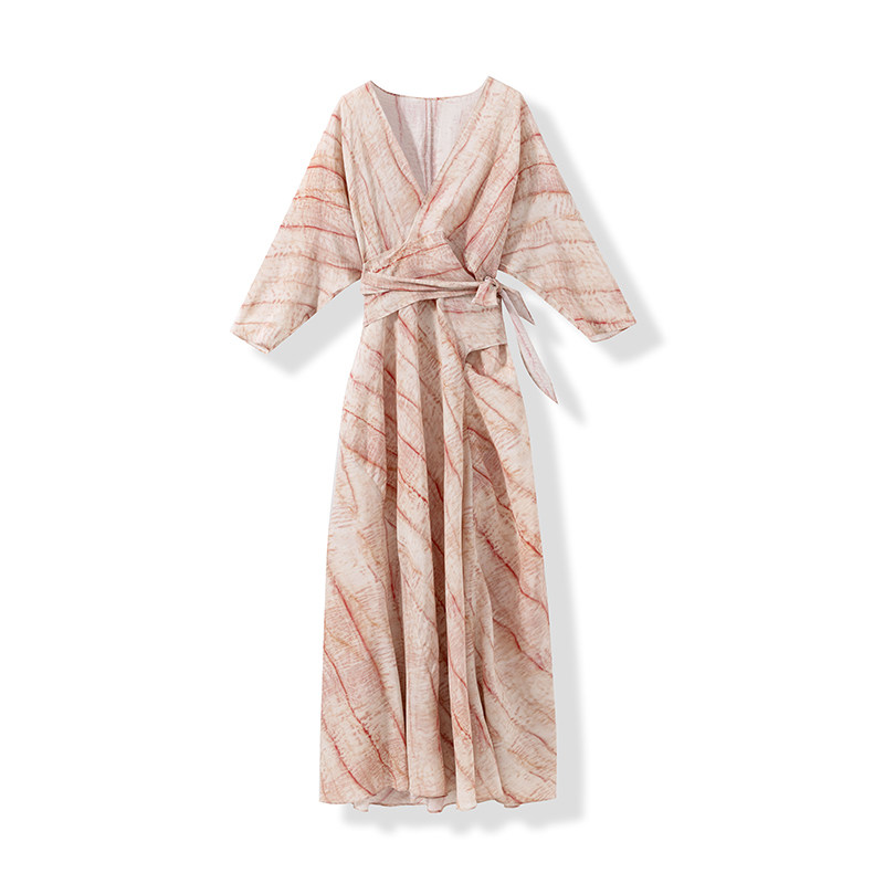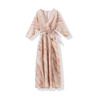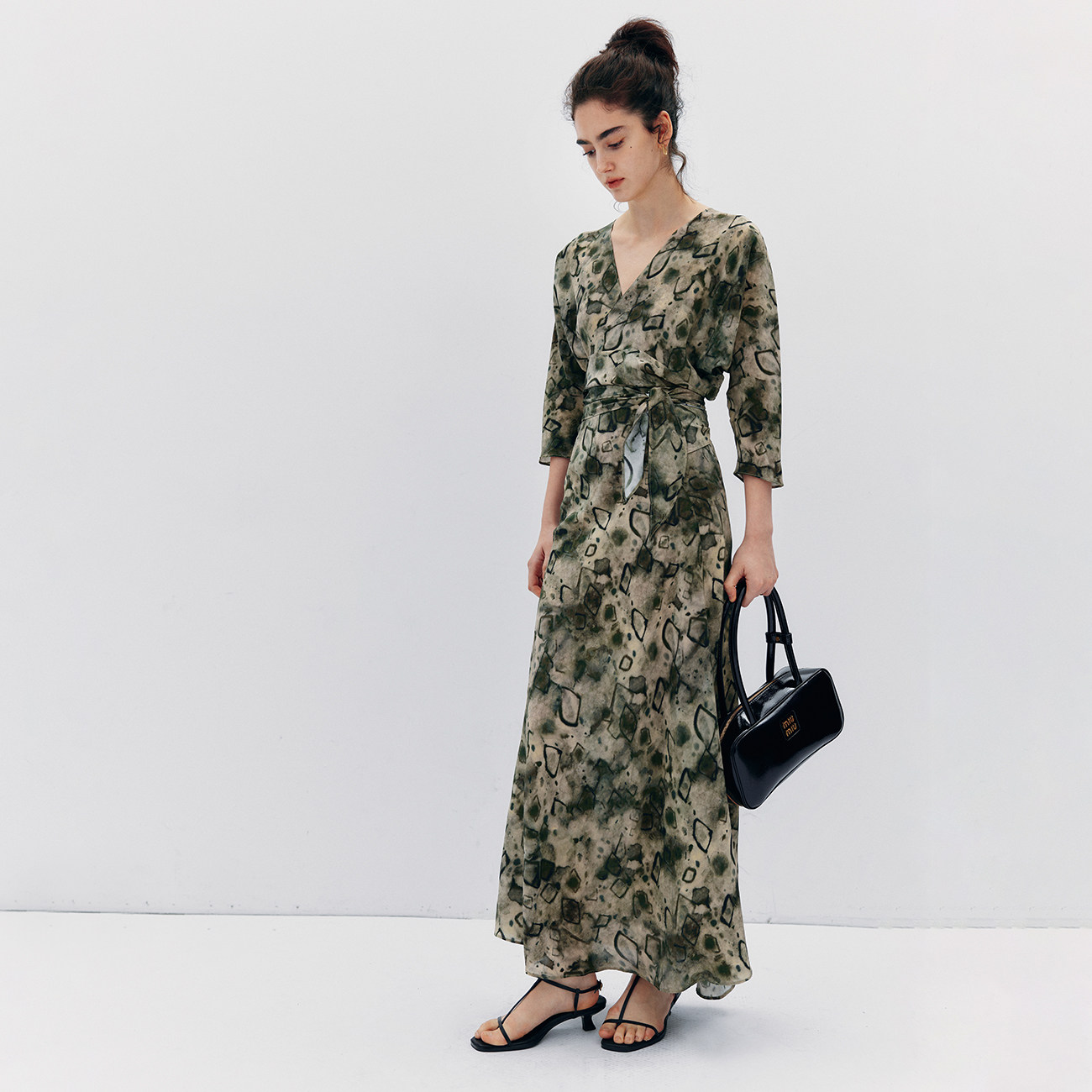 晕染印花V领围裹系带七分袖 真丝艺术宣言 法式 连衣裙 中长款