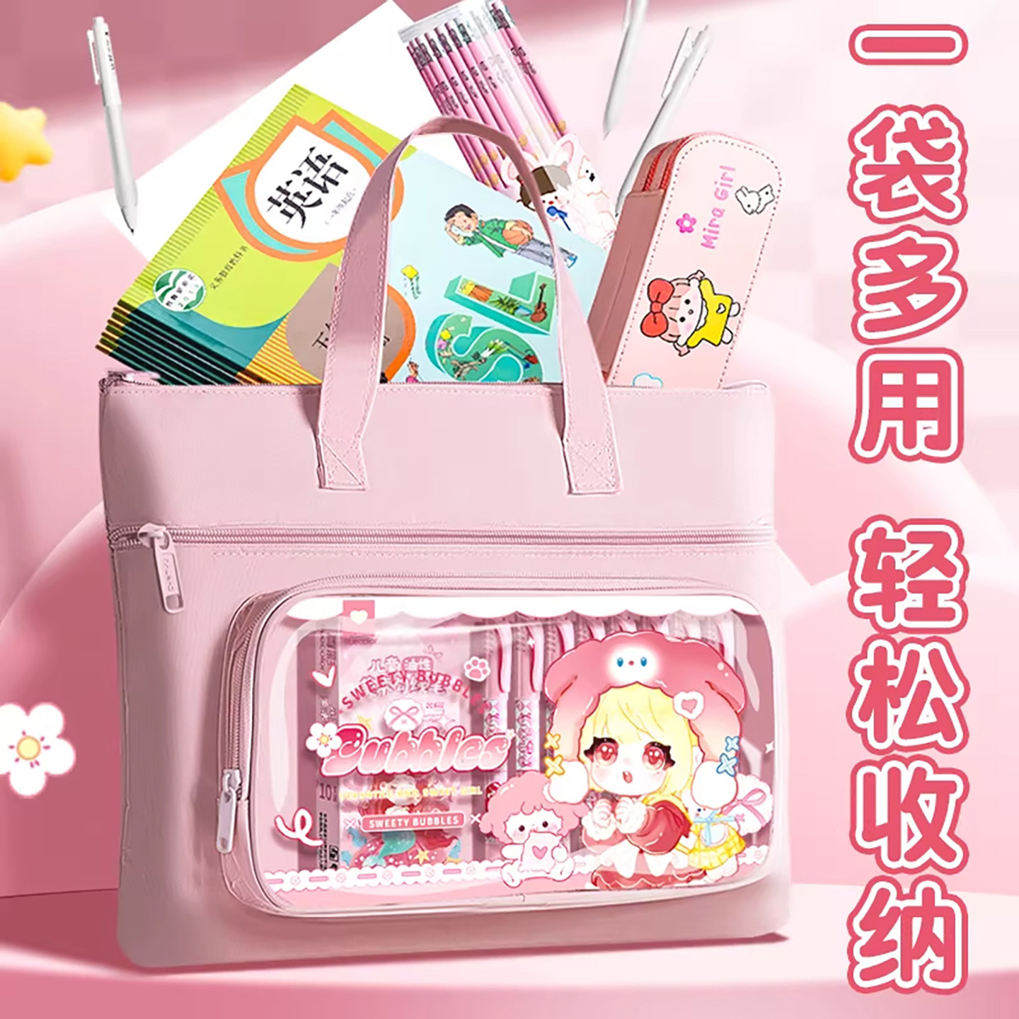 小学生初中生专用手提书袋高中生试卷资料书本作业袋子档案科目分类袋 双层大容量A4透明网纱文件收纳袋拉链式