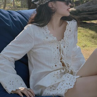 上衣 TOP家 自然织物 南法复古镂空绣花V领天丝亚麻长袖 抽绳短裤由