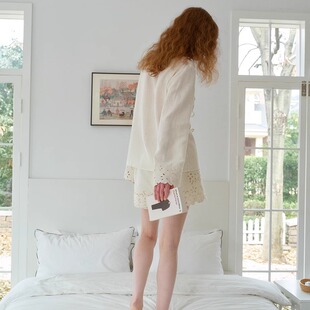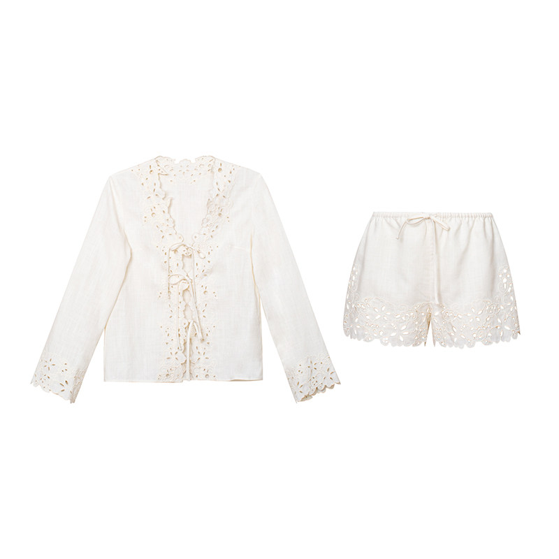 上衣 TOP家 自然织物 南法复古镂空绣花V领天丝亚麻长袖 抽绳短裤