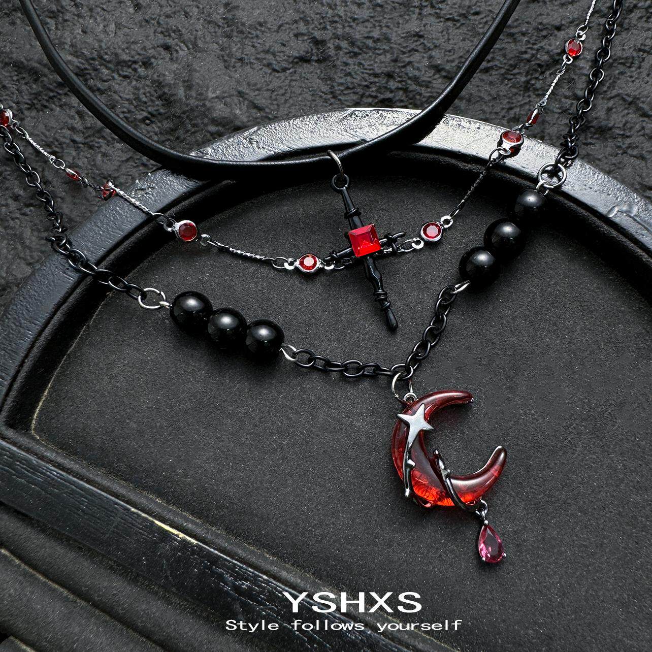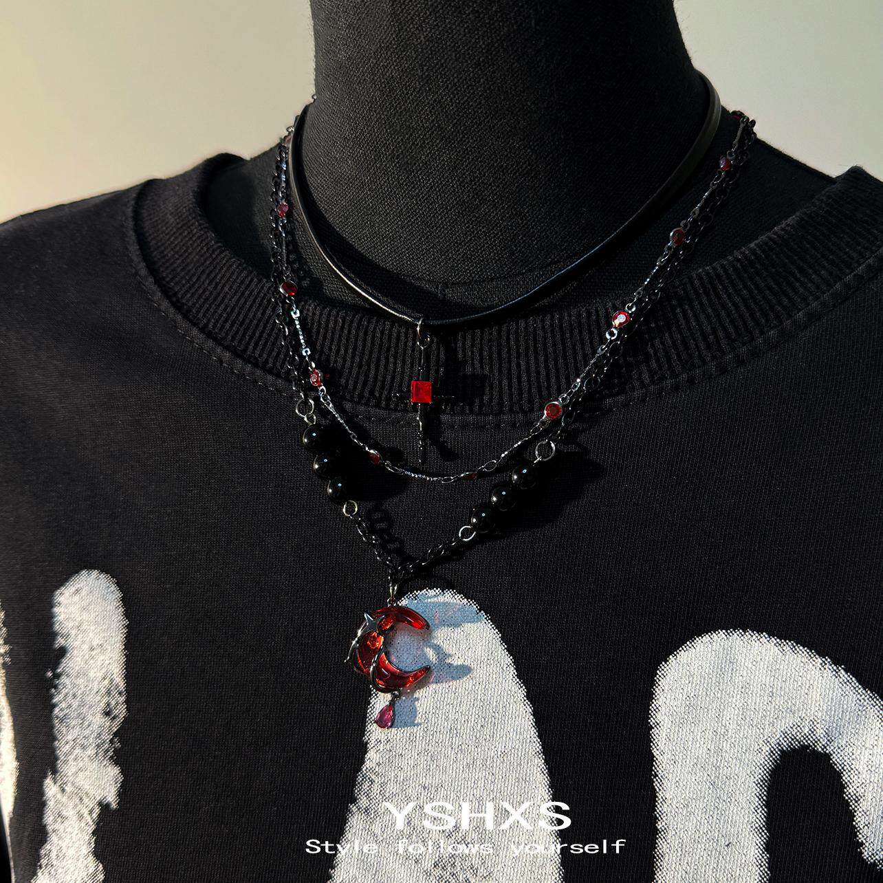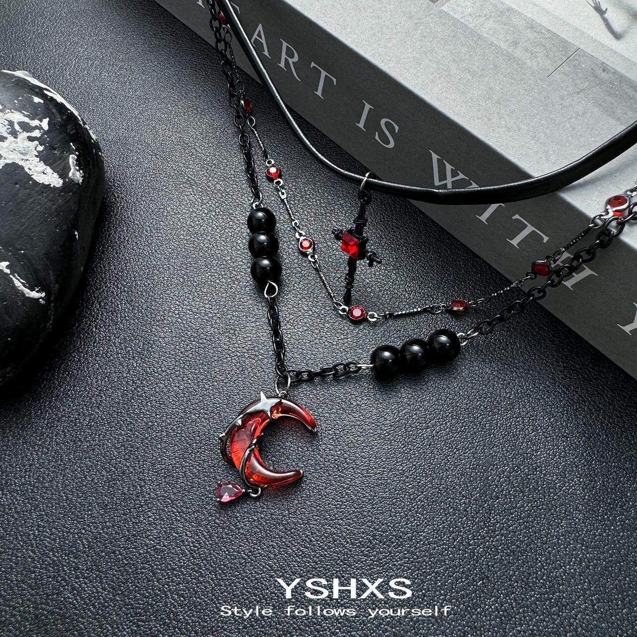 猩红月牙多层叠戴项链十字吊坠项圈拼接多层锁骨链哥特亚文化配饰