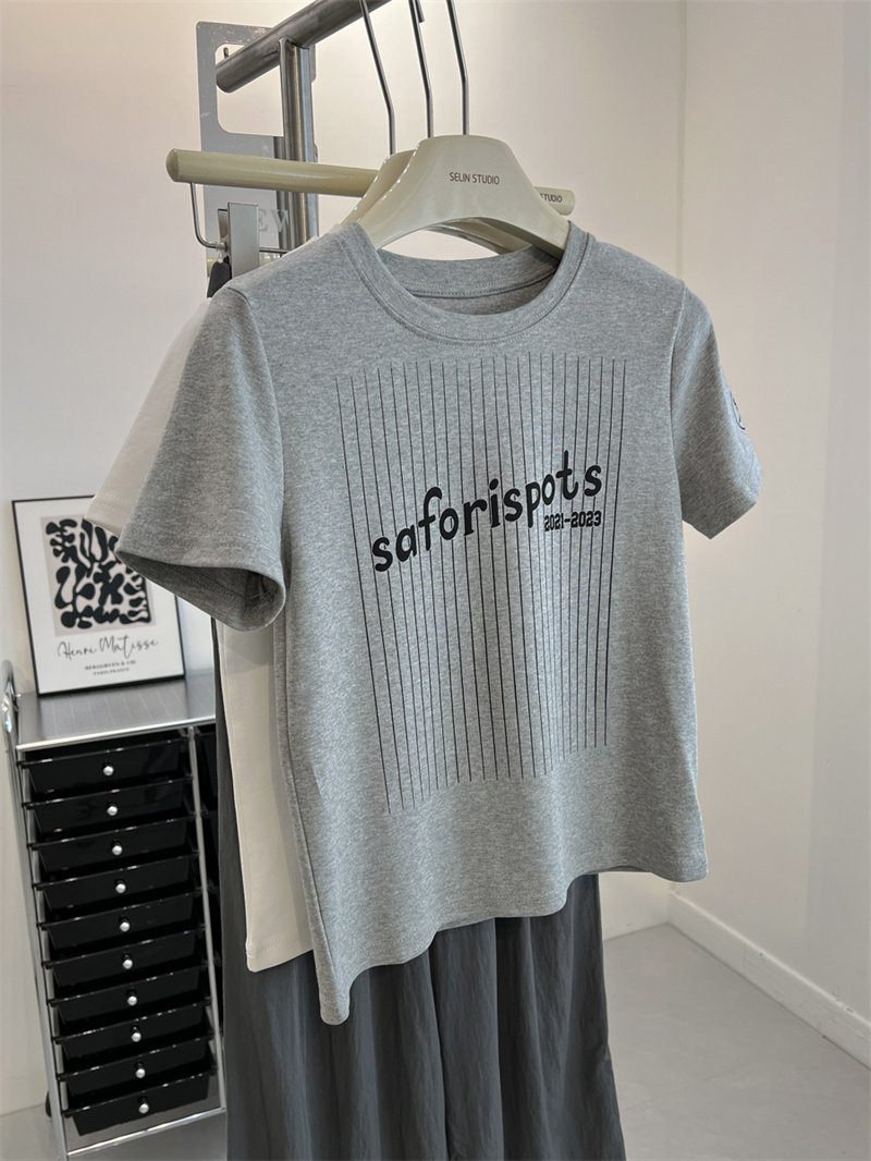 短款 美式 街头bf中性运动风字母印花圆领短袖 t恤女修身 上衣 打底衫由