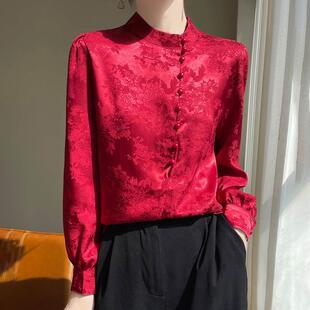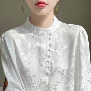 轻国风白色真丝衬衫 长袖 立领衬衣中式 印花通勤上衣 女职场穿搭春季