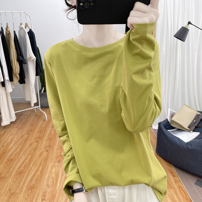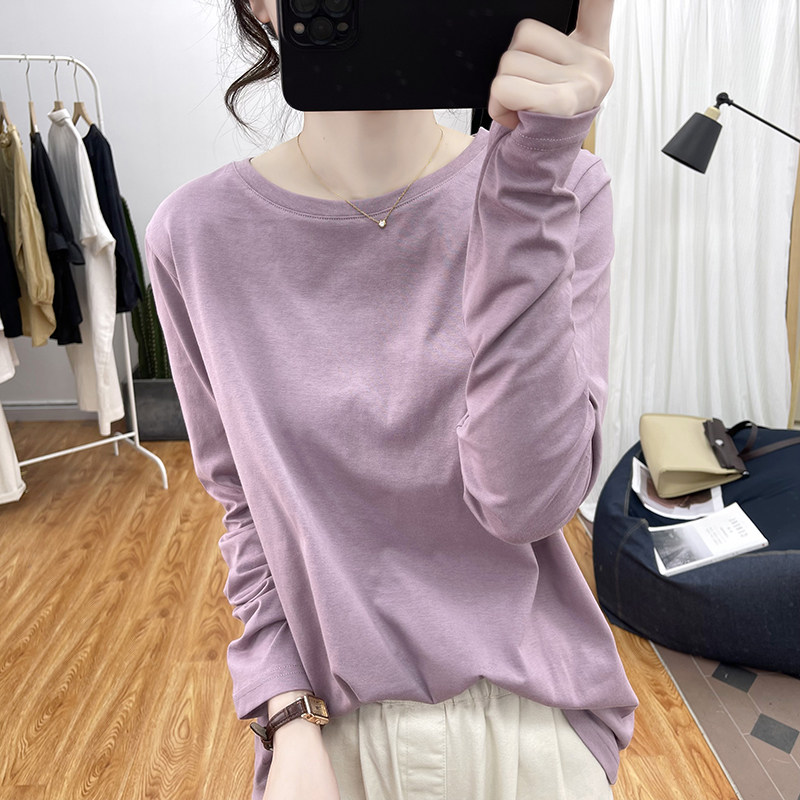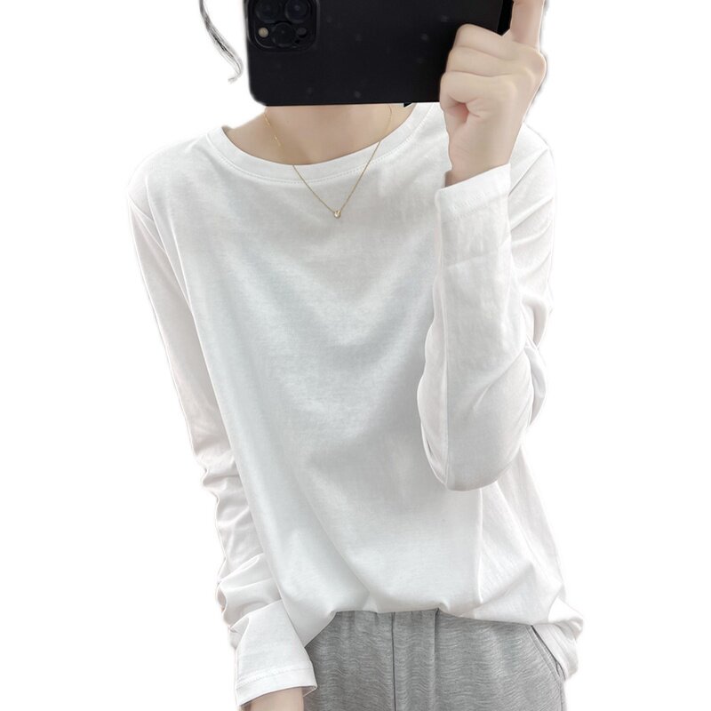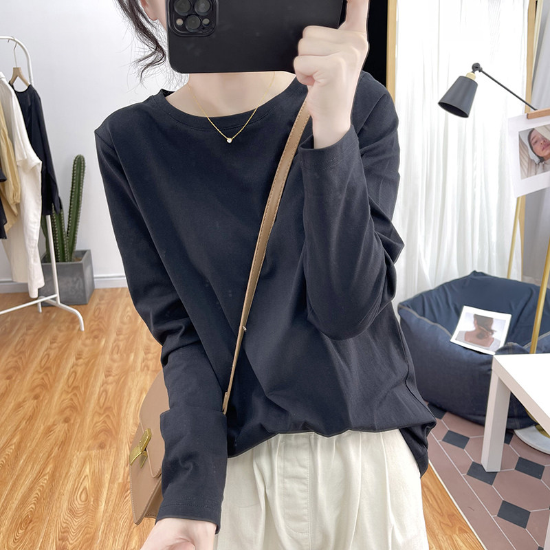 韩系复古春秋宽松圆领上衣打底衫 体恤 白色T恤女式 高品质纯棉长袖由