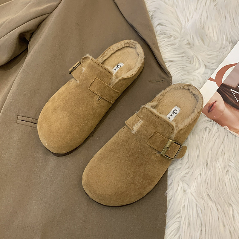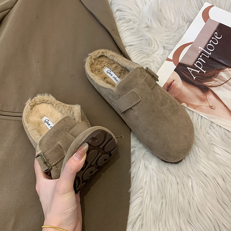 平底真皮包头半拖鞋 秋冬加绒勃肯鞋 孕妇毛毛棉拖鞋 女外穿2026新款