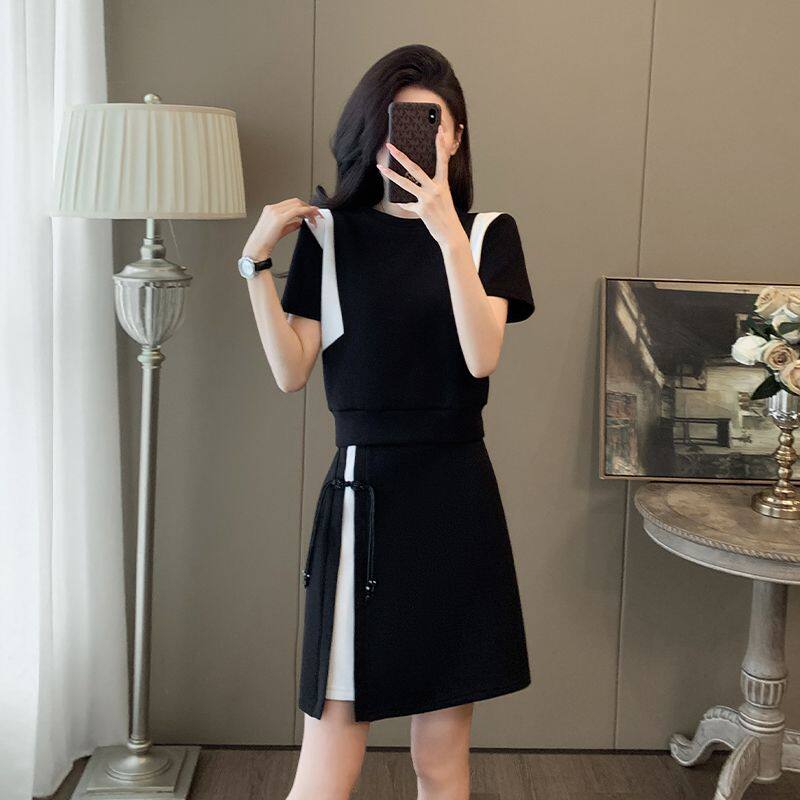 女夏独特拼接短袖 T恤显瘦短裙两件套洋气 套装 欧洲站休闲时尚