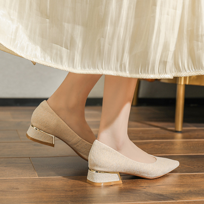 一脚蹬婚鞋 真皮 骄屿气质尖头粗跟玛丽珍法式 浅口单鞋 裸色高跟鞋