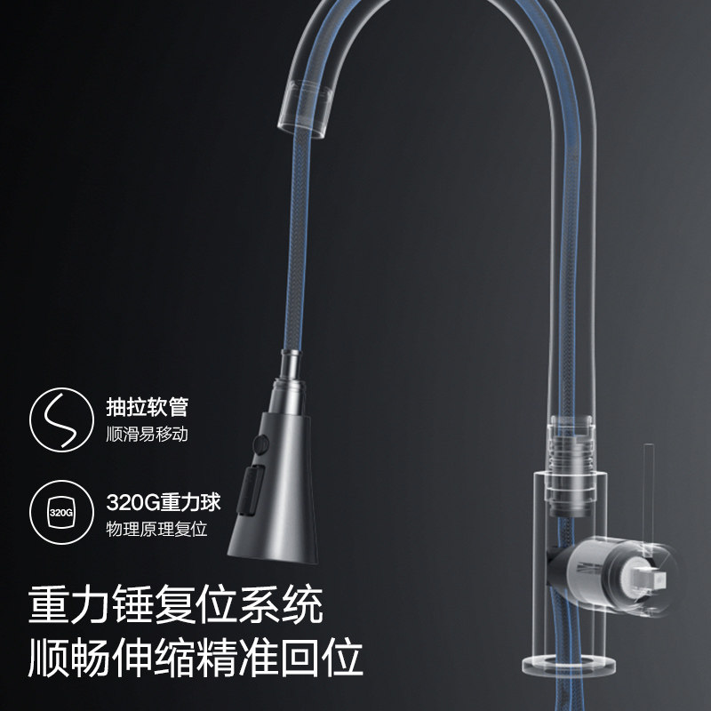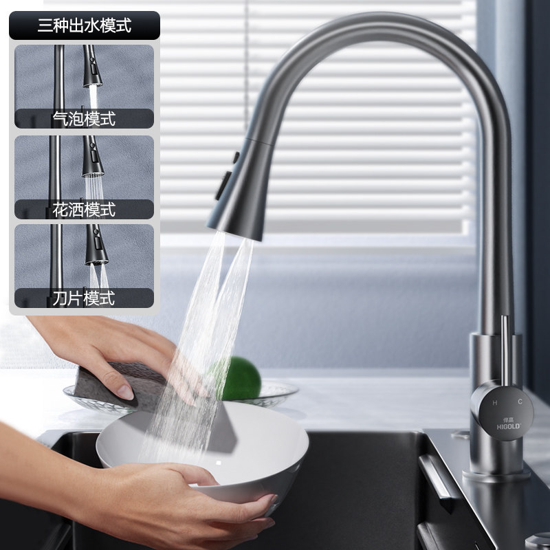 出水枪灰色抽拉龙头 悍高厨房水槽龙头304不锈钢冷热龙头刀片式