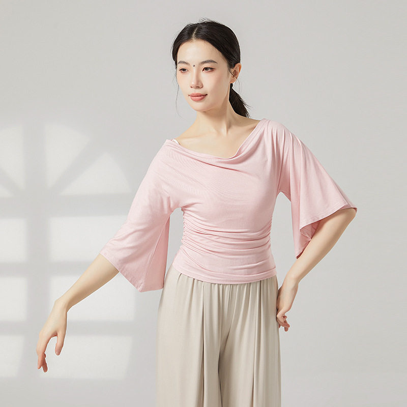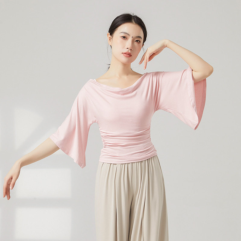 设计感洋气喇叭袖 古典舞气质上 T恤女款 现舞服慵懒风一字肩修身