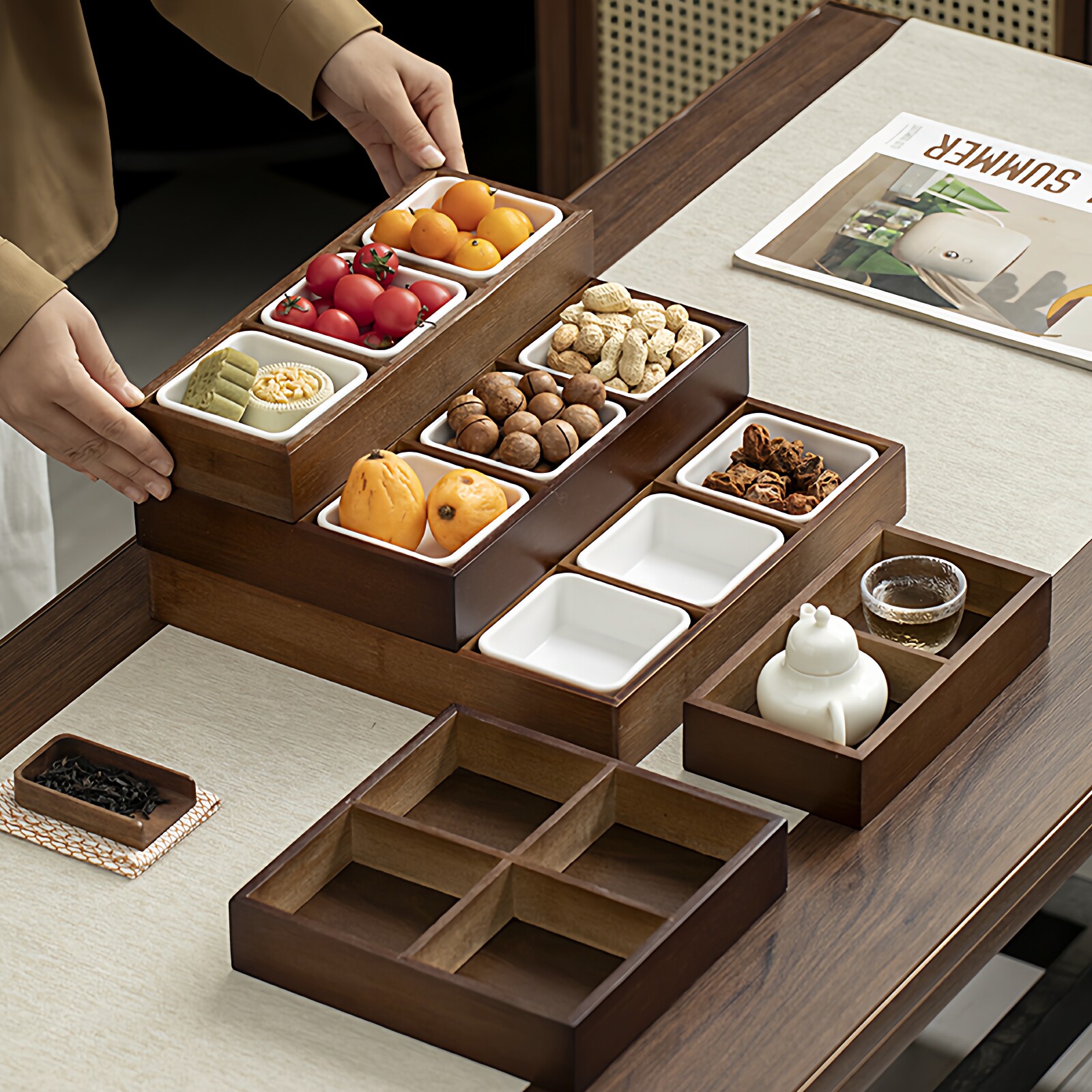 为您提供商品火锅盘九宫格餐盘拼盘分格小吃干果盒 围炉煮茶摆盘实木胡桃色日式的详细介绍,