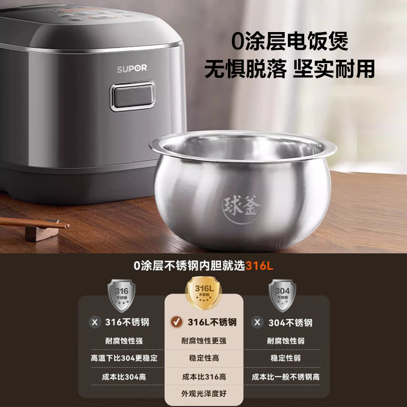 苏泊尔316L不锈钢有钛0涂层球釜电饭煲IH智能加热多功能4升不粘锅
