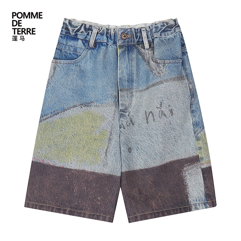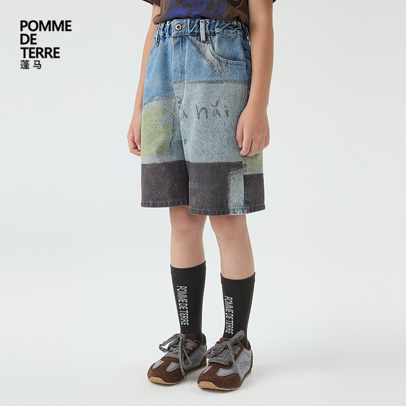蓬马大童牛仔中裤 男女儿童pomme terre 子印花彩牛棉质春夏装由