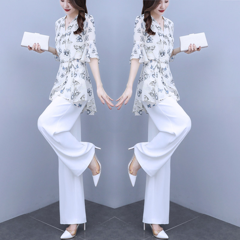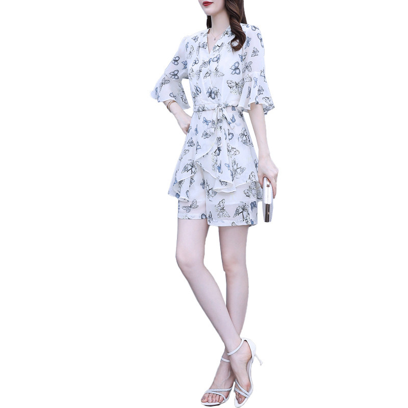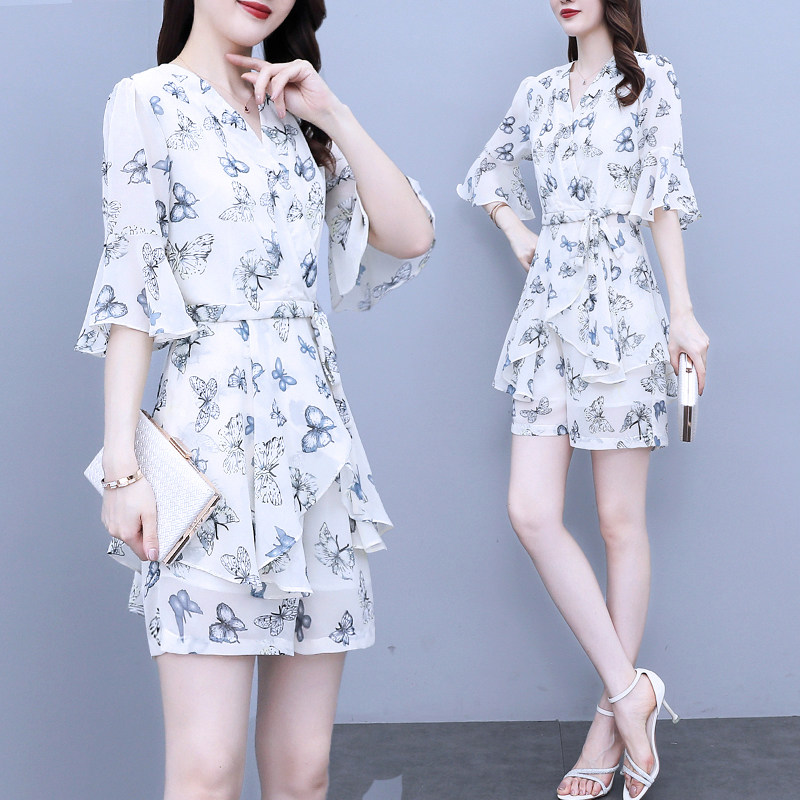 新款 炸街短裤 套装 女夏季 两件套女 2021气质显瘦减龄洋气雪纺阔腿裤