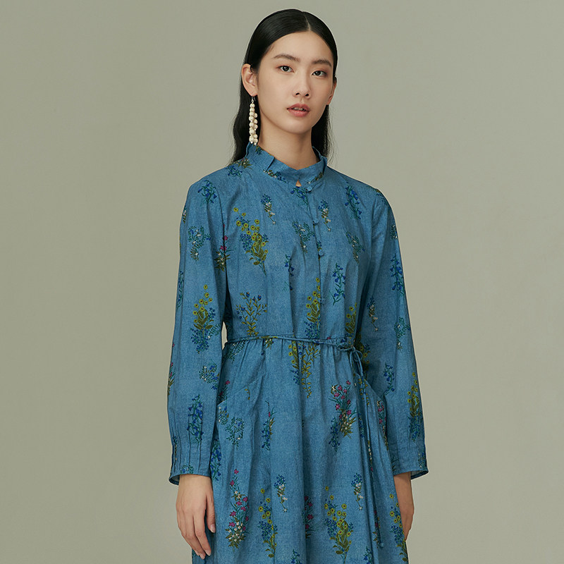 Hotdog 花落梦夕 收腰显瘦V领木耳边繁花长袖 连衣裙 热狗很辣
