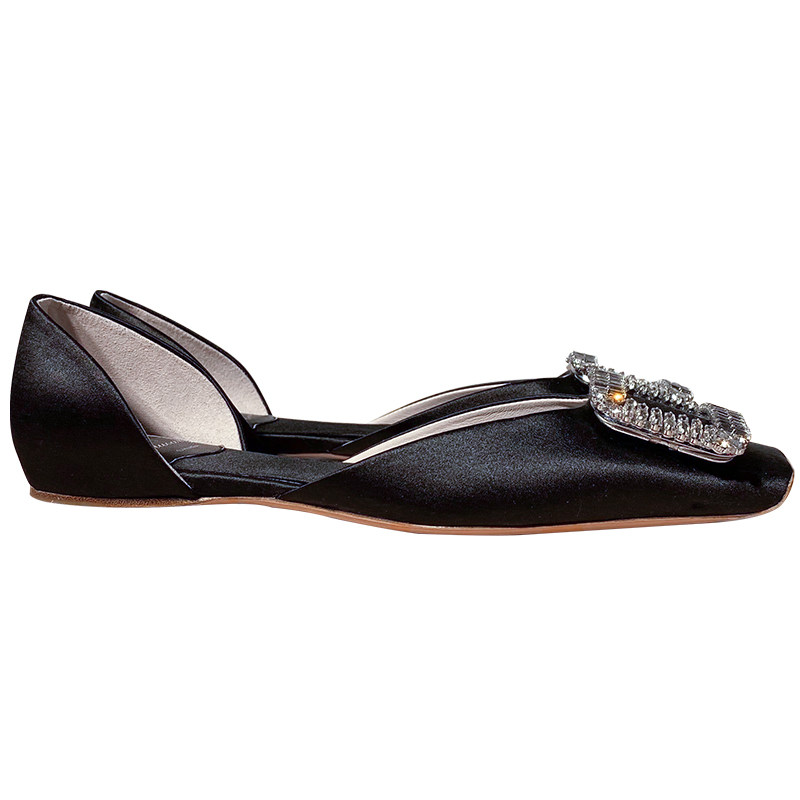 法式 RV方扣水钻中空平底单鞋 女夏方头绸缎面浅口婚鞋 瓢鞋 伴娘女鞋
