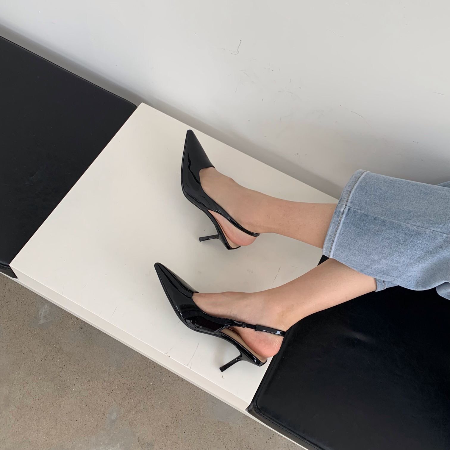 千百度牛漆皮细高跟时装 女新款 尖头包头后空绝美凉鞋 气质百搭 凉鞋