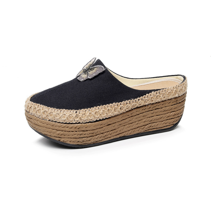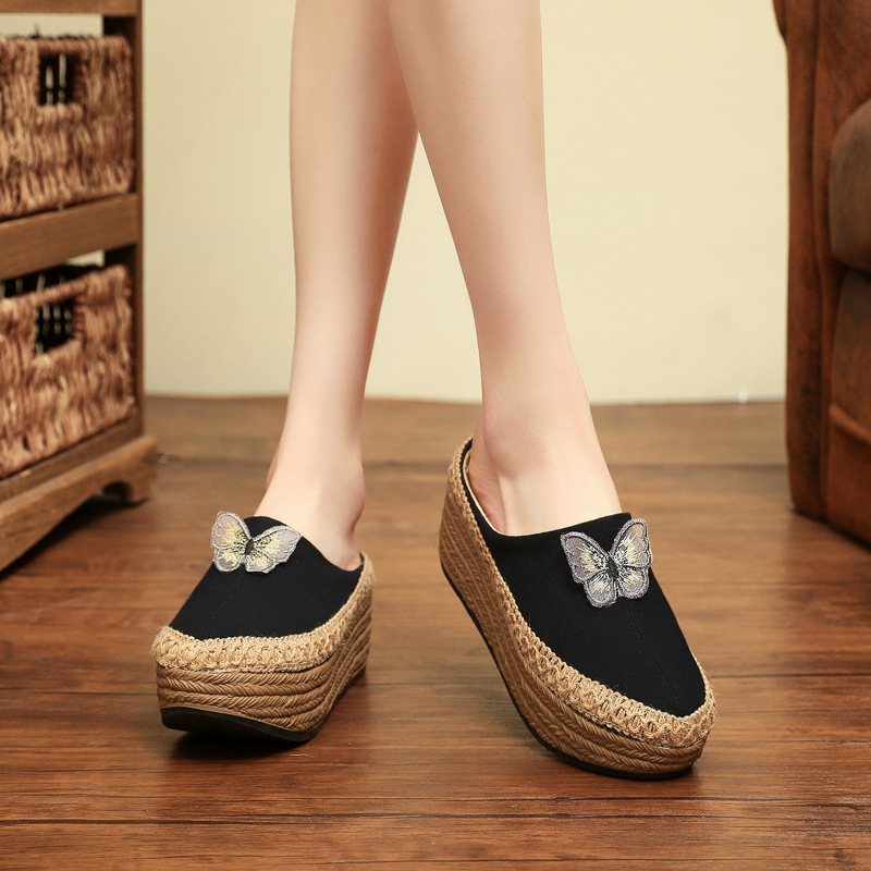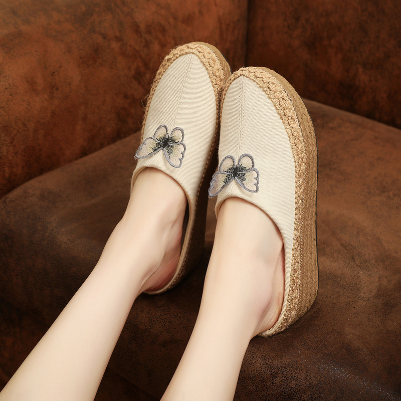 新款 女鞋 高跟松糕跟外穿凉拖复古绣花民族风坡跟布鞋 蝴蝶半棉拖鞋