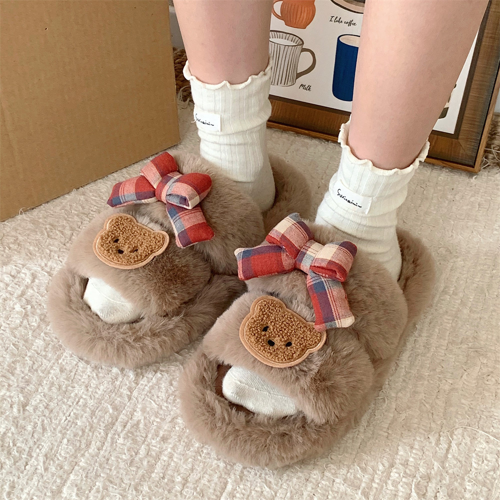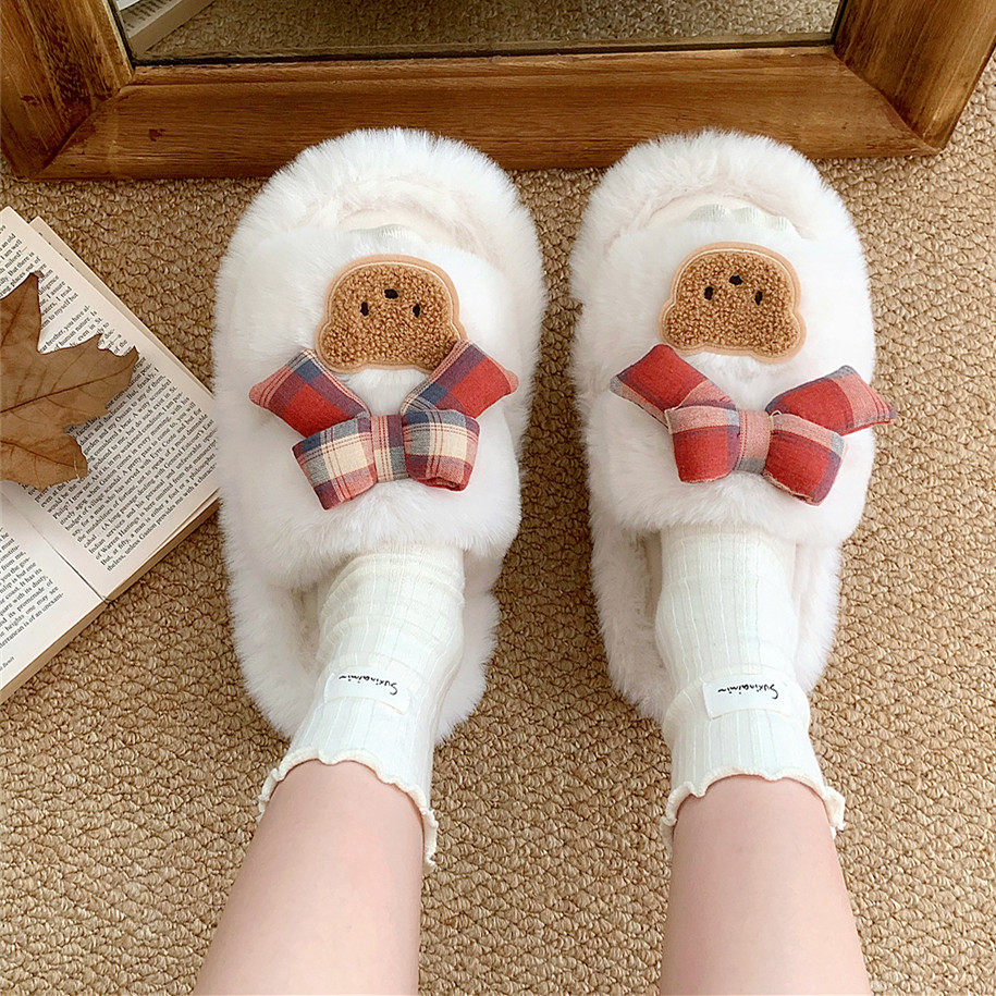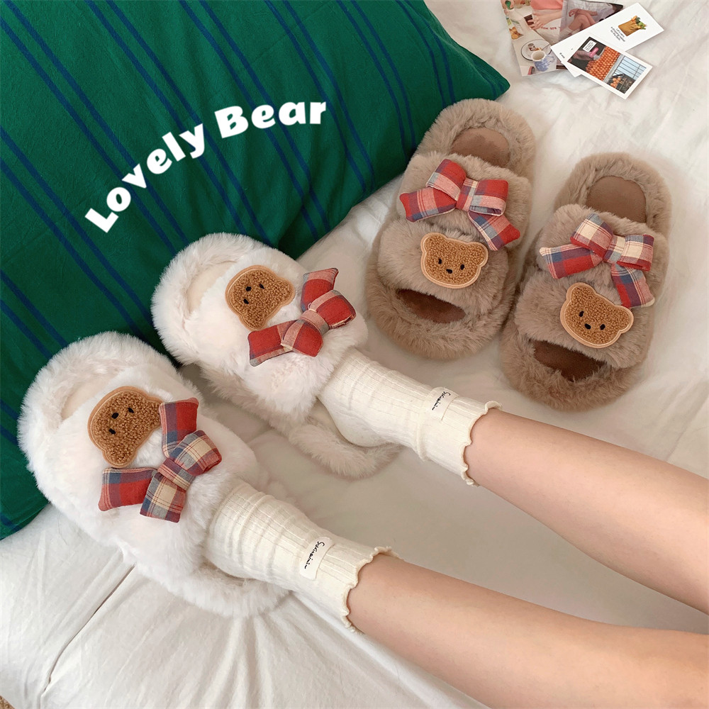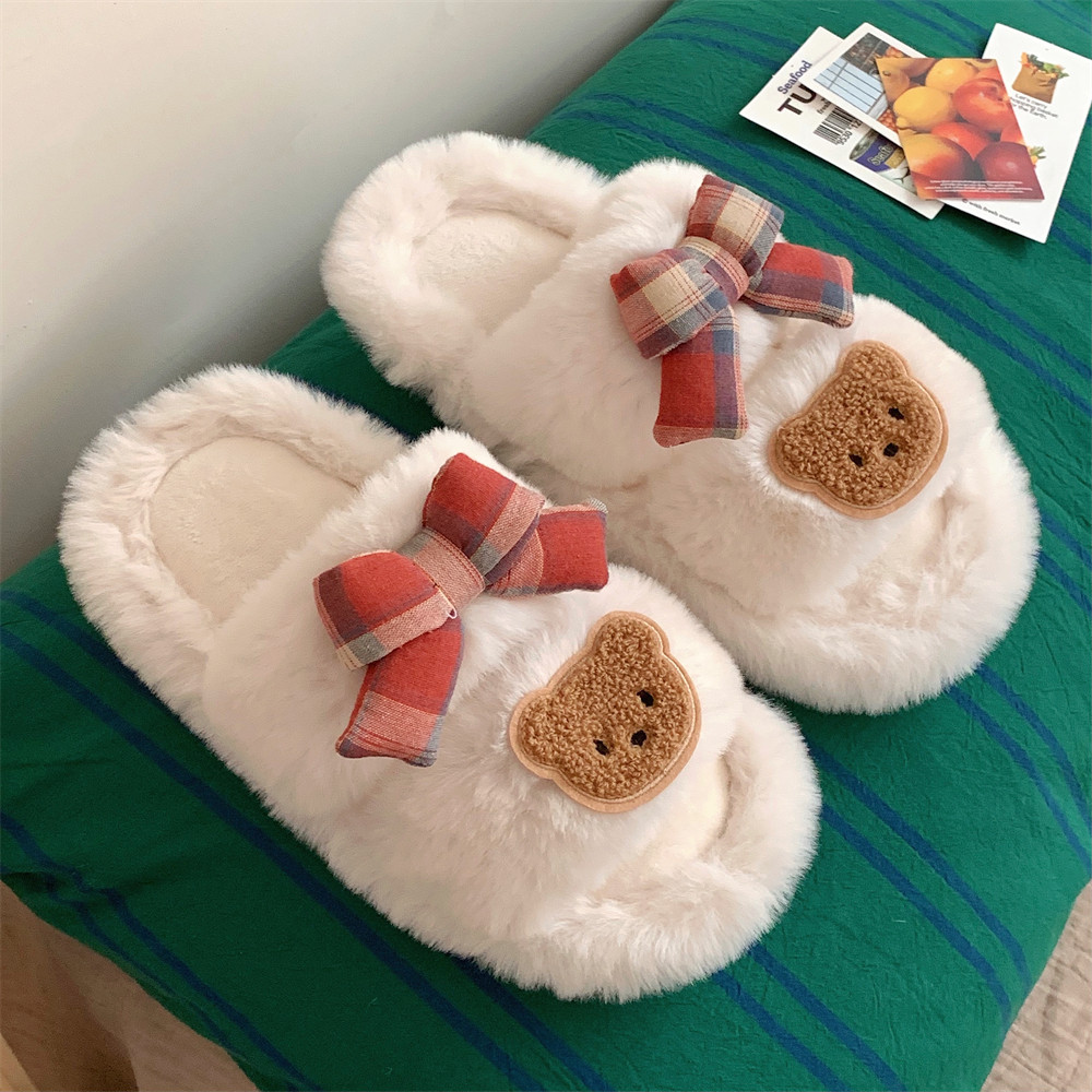 细细条 女卧室家居防滑冬季 蝴蝶结毛毛拖鞋 少女心小熊二字棉拖鞋