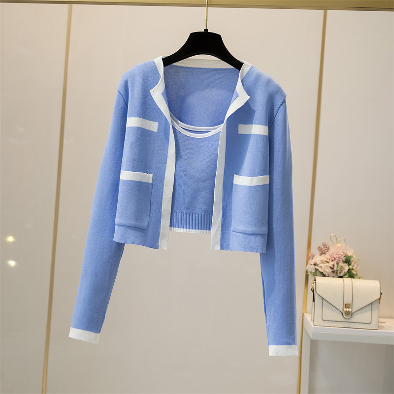 2026年新款 网红气质吊带背心上衣两件套 外套女早秋装 撞色针织开衫