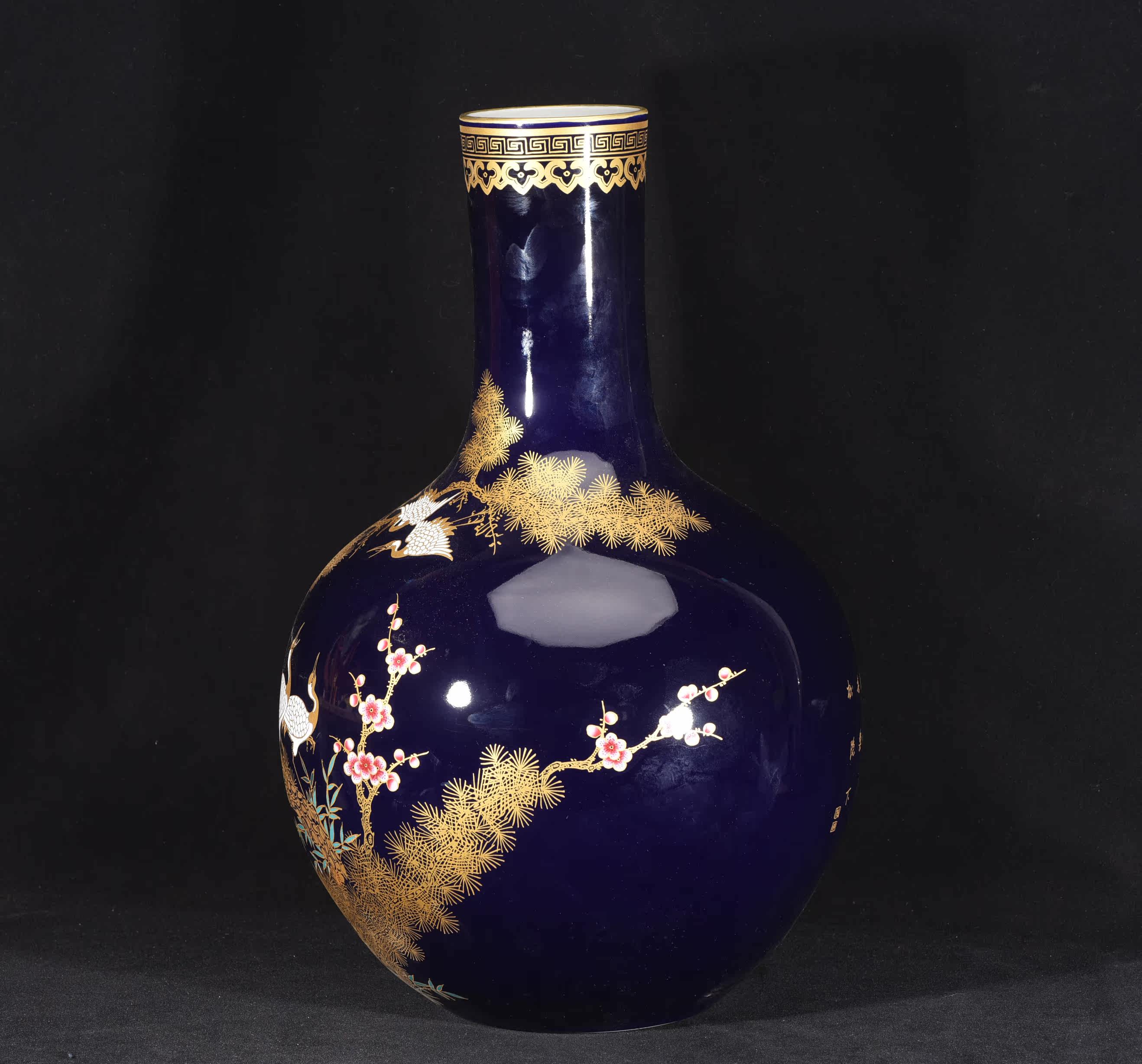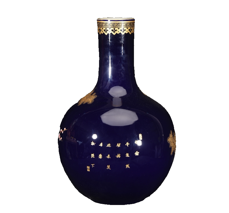 大清乾隆年制霁蓝釉五彩描金六合同春纹天球瓶由