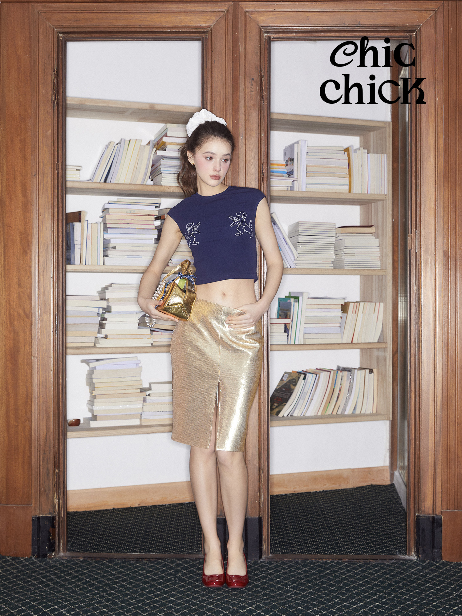 ChicChick时髦小鸡vol19黄金猎犬复古纹章刺绣藏蓝小飞袖 T恤 短款