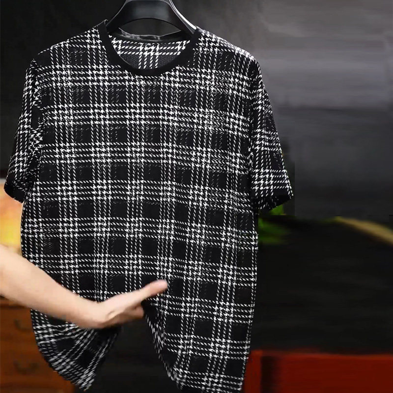 潮流男装 镂空短袖 速干T恤肥佬透气青年格子体恤夏装 5XL 加肥加大码