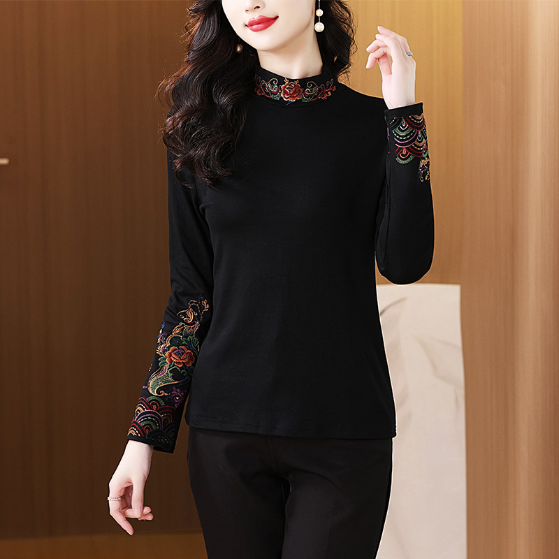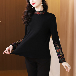 新款 洋气妈妈加厚磨毛长袖 T恤女装 秋冬季 民族风刺绣半高领打底衫