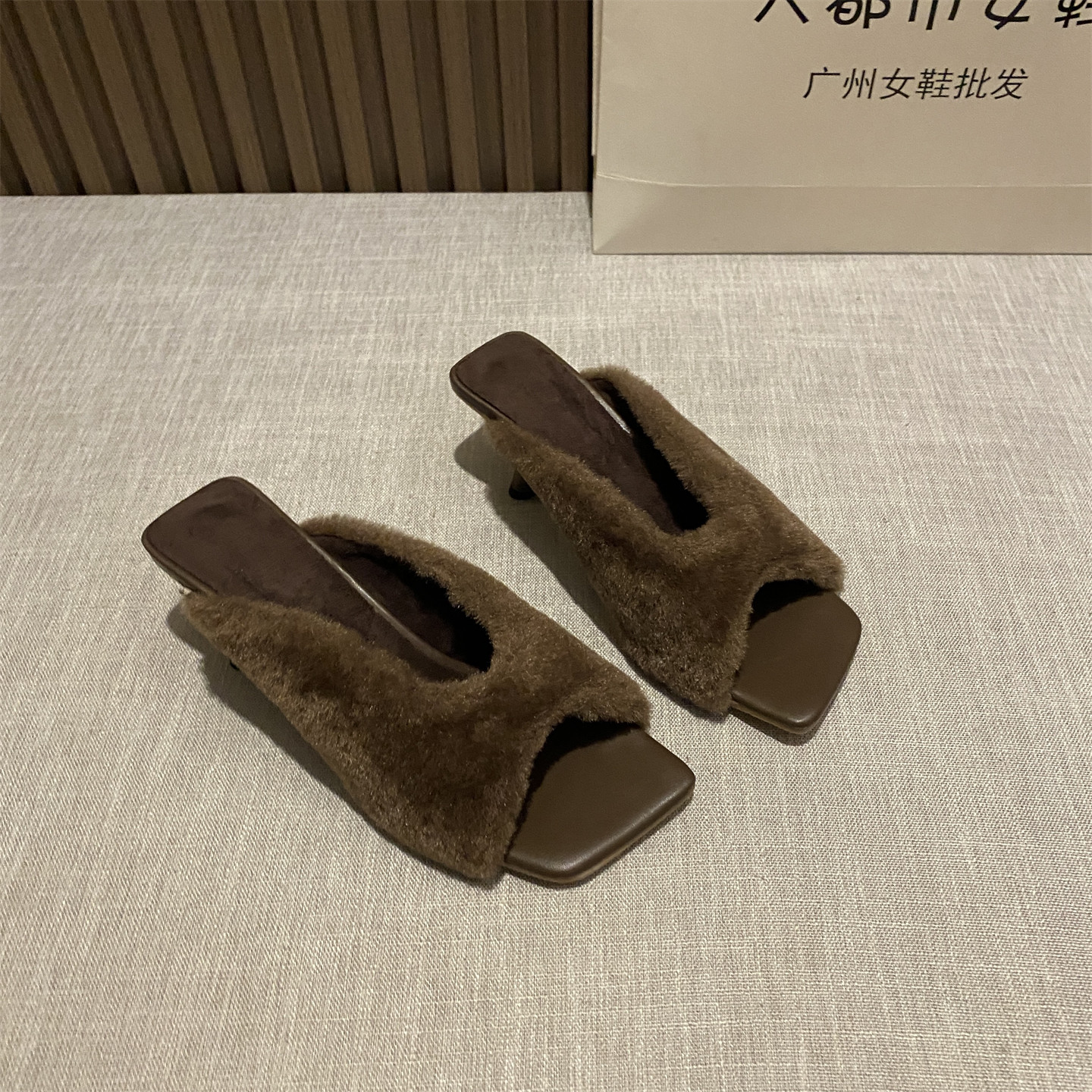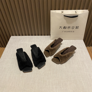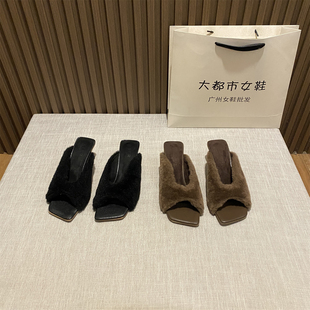女外穿气质毛绒绒懒人一字棉拖鞋 复古方头毛毛拖鞋 2025年秋冬新款