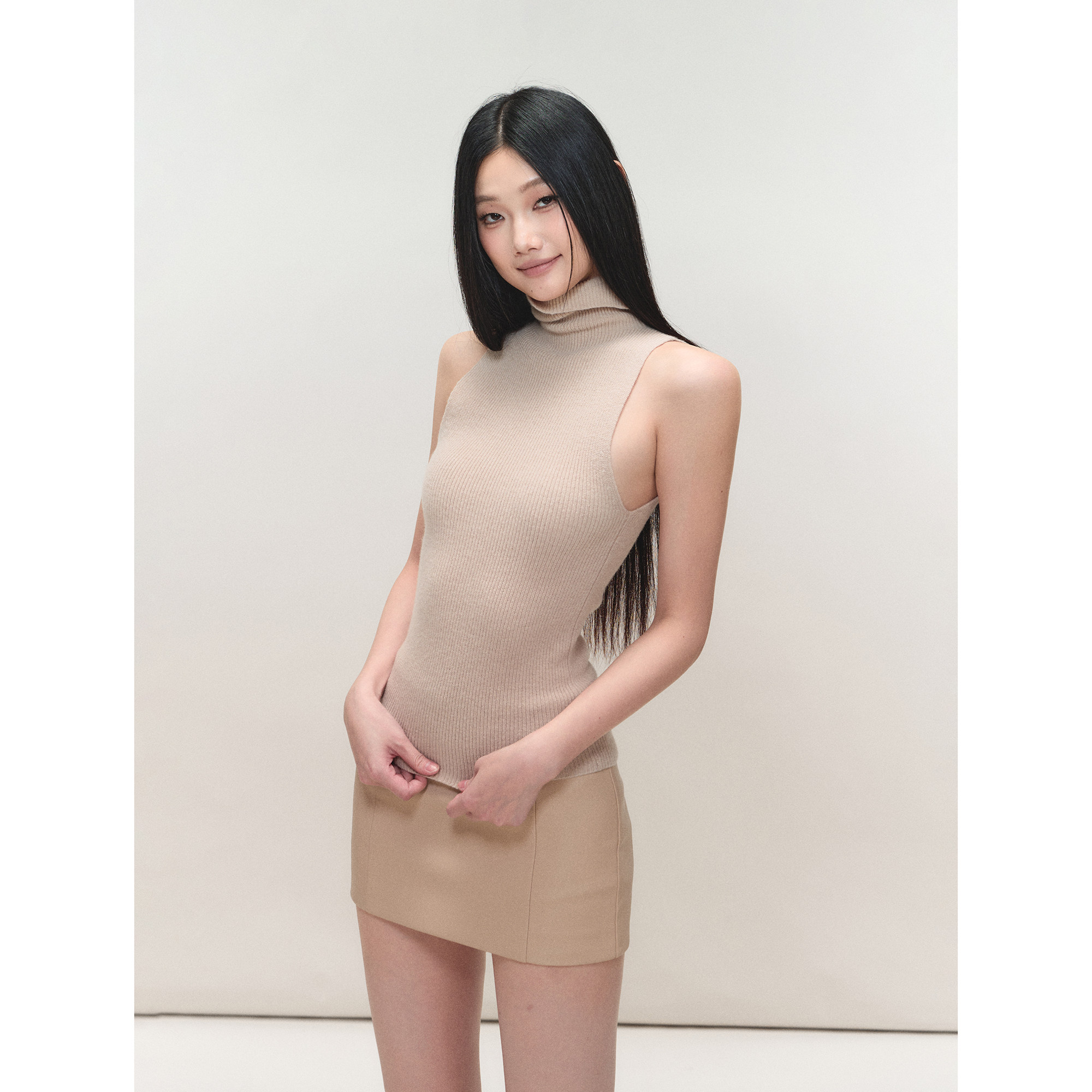 弹力无袖 针织全羊毛背心上衣女PU弹力低腰包臀短裙 高领修身 PEMPL由
