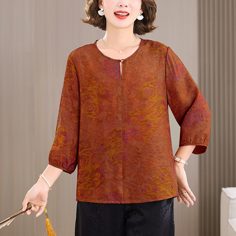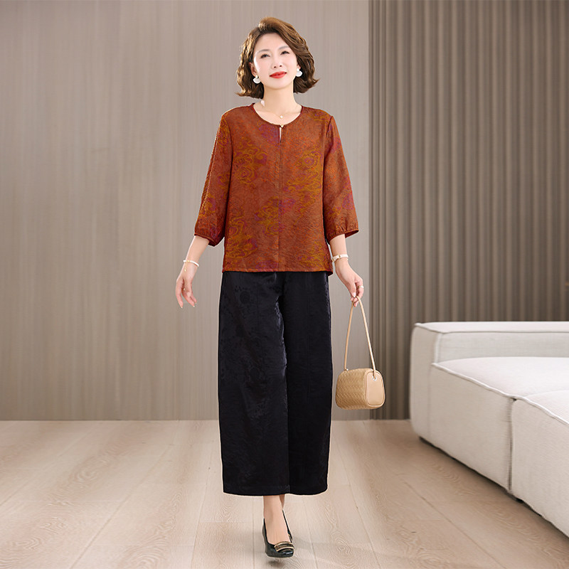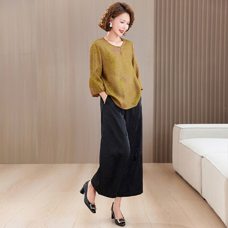 中老年妈妈真丝两件套香云纱上衣女夏季 阔腿裤 套装 浮光锦宽松小衫