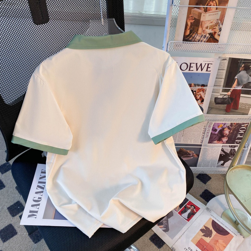 设计大码 慵懒风夏季 拼接上衣短袖 简约POLO美式 女 宽松学院T恤新款
