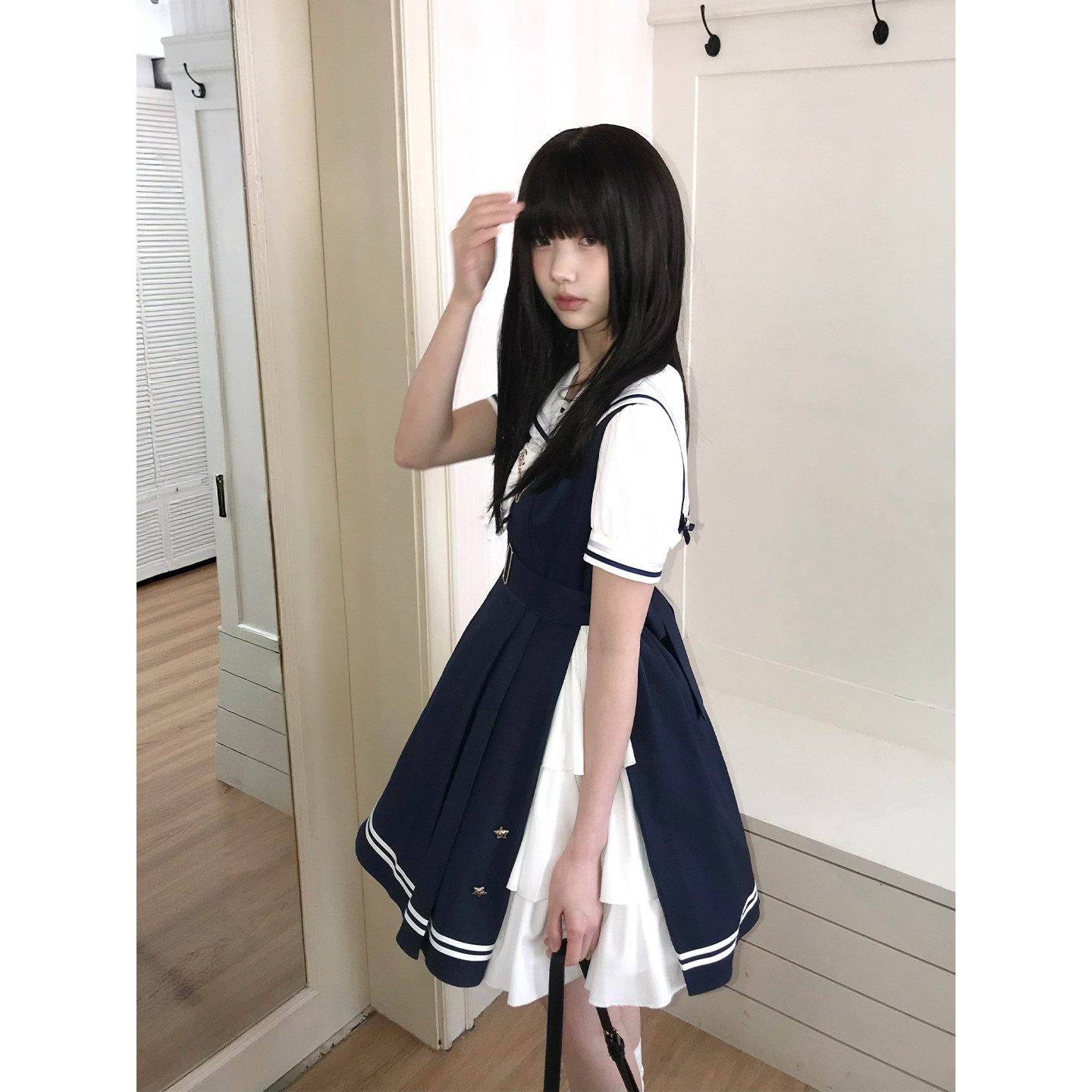 啦啦酱 海军领学院风连衣裙蓝色拼接收腰大裙摆短裙女 京都星光由