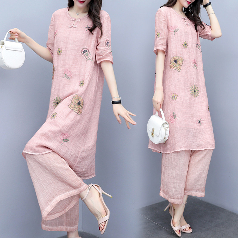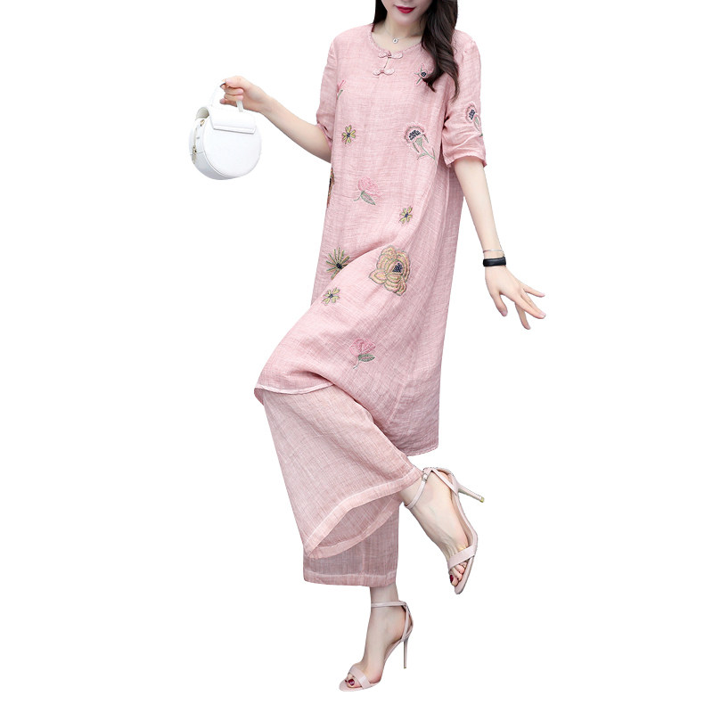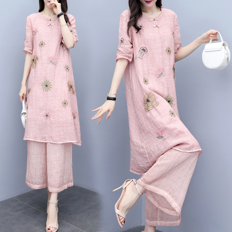 粉色刺绣两件套阔腿裤 女装 新款 休闲时尚 女大码 套装 2021夏季