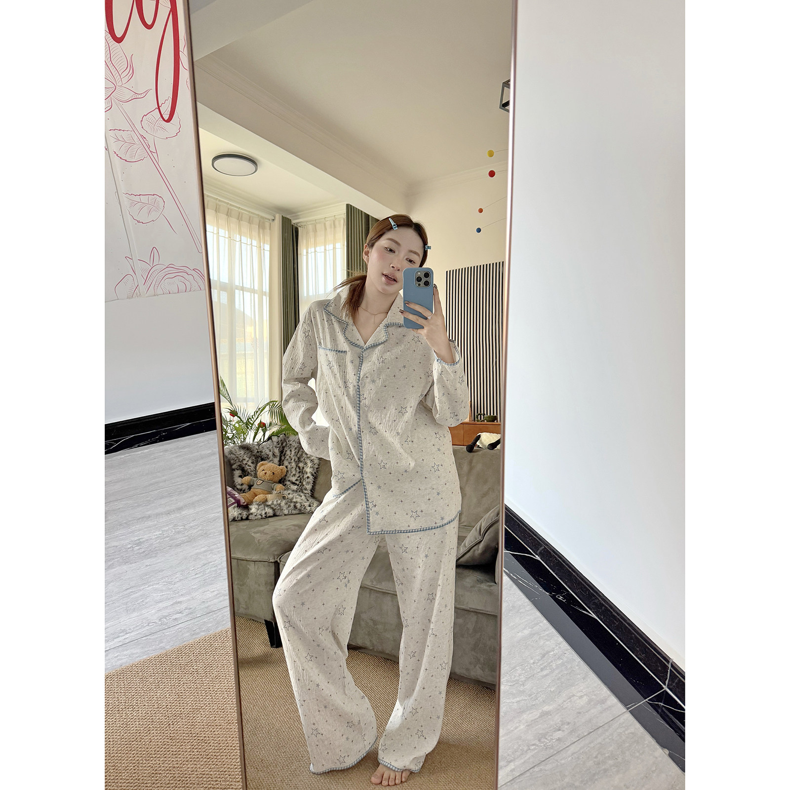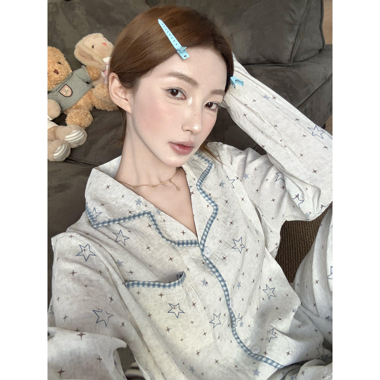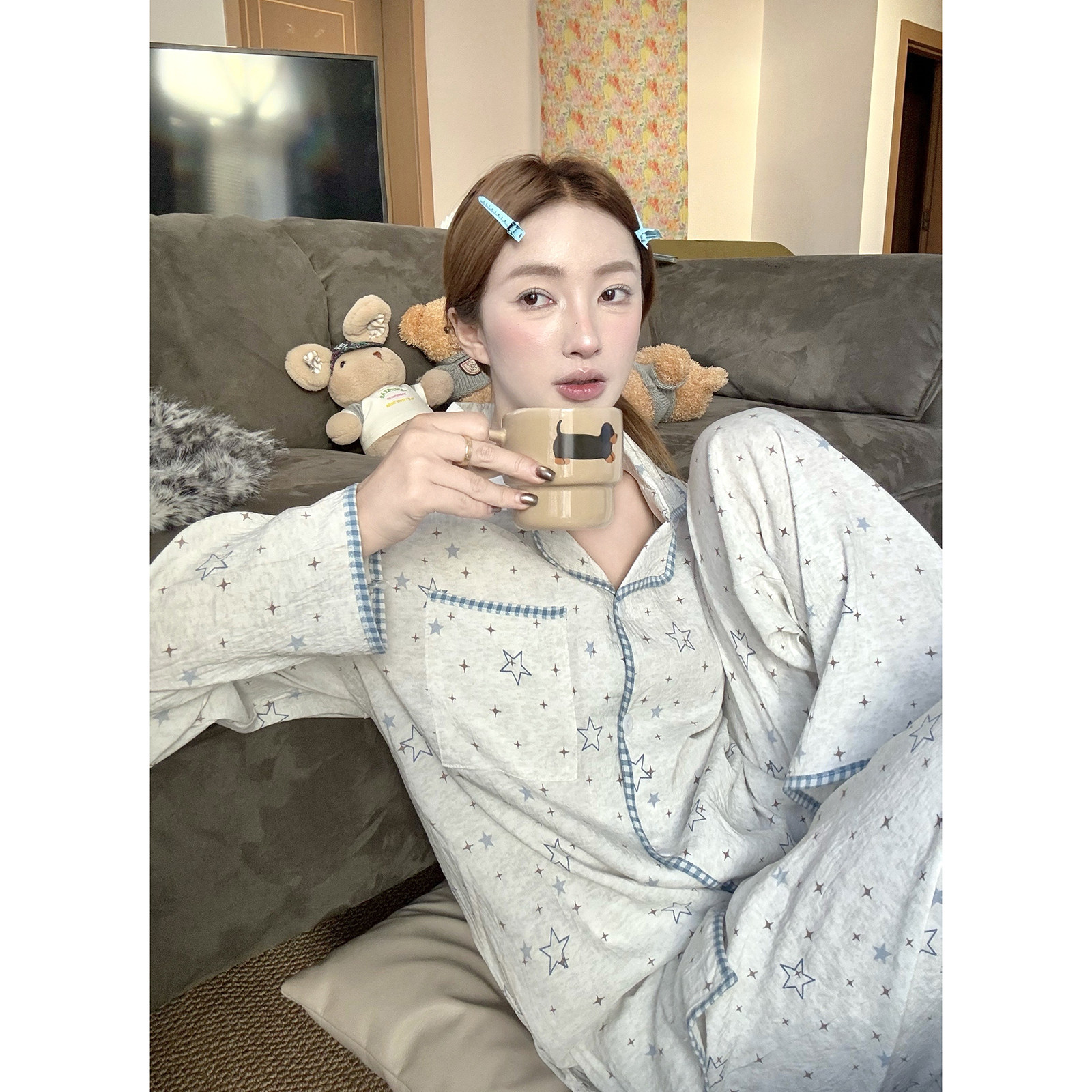 家居服套装 睡衣女春夏宽松舒适翻领开衫 JoyceBra甜美星星印花长袖