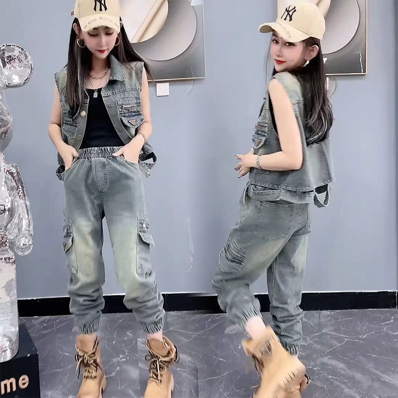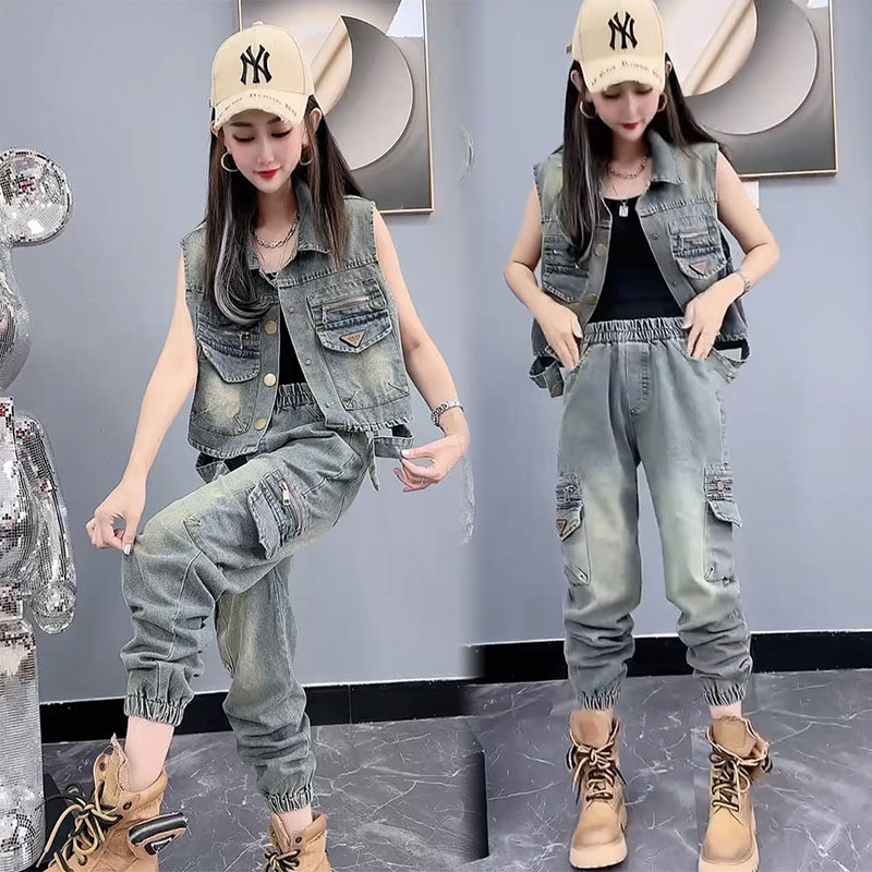 女洋气牛仔马夹束脚工装 2024秋流行新款 时尚 套装 显瘦休闲两件套 裤