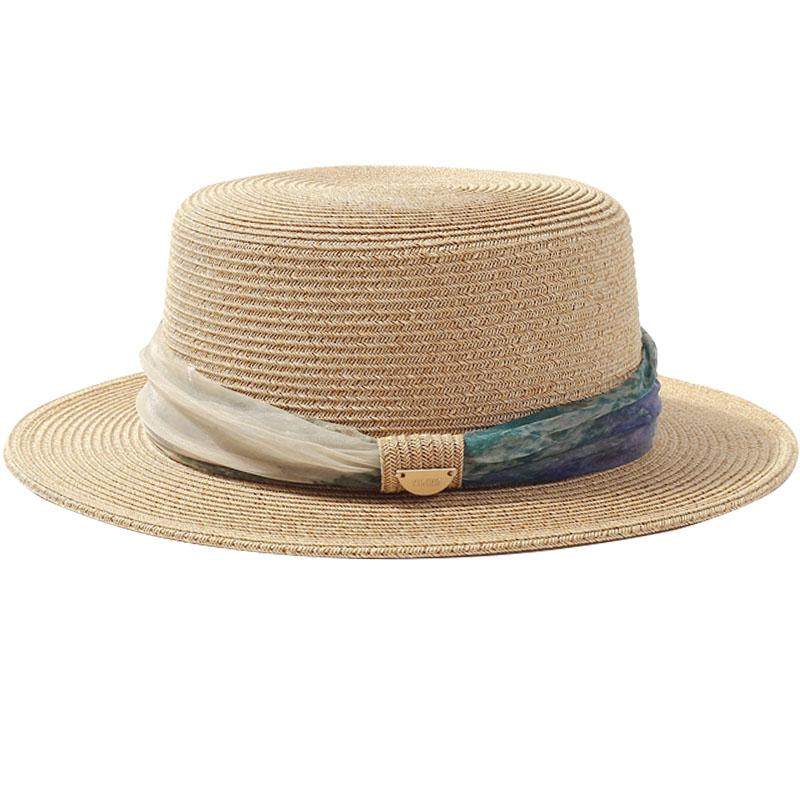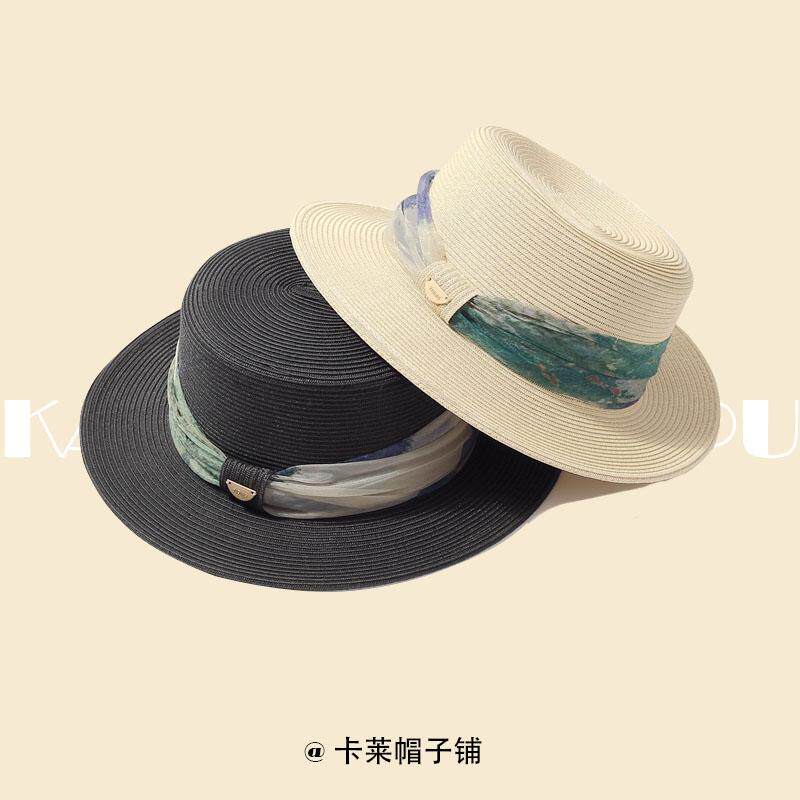 青绿香云纱细草编平顶帽子女夏季 文艺优雅礼帽遮阳出游沙滩帽 法式由