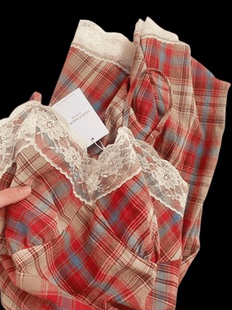中长款 气质裙子 复古蕾丝花边格子吊带连衣裙女春夏季 早春2023法式