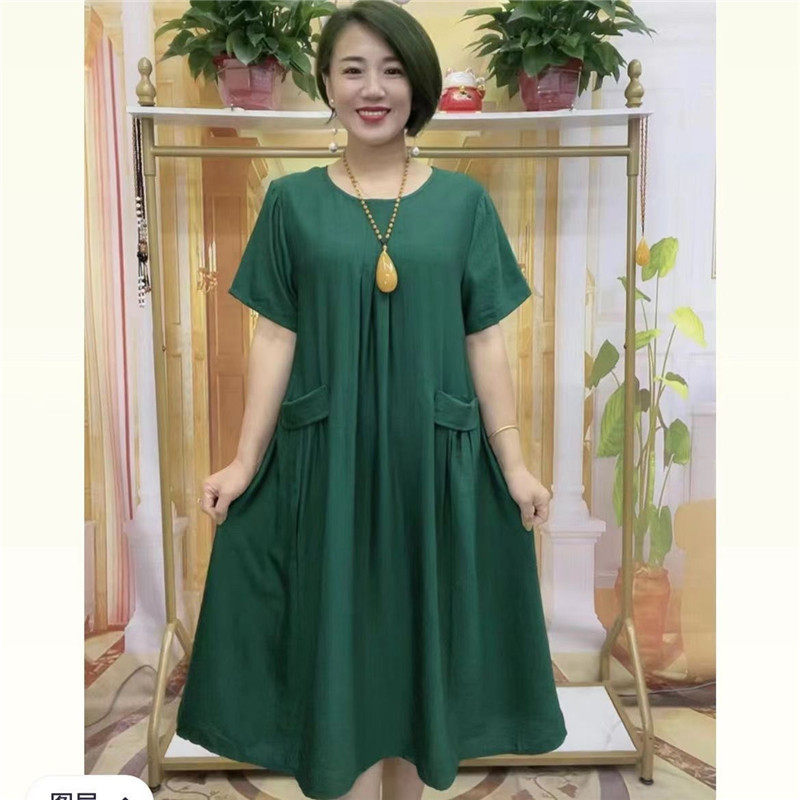 圆领欧美连衣裙夏季 新款 中年妈妈修身 显瘦短袖 中长裙大摆裙子 女装由