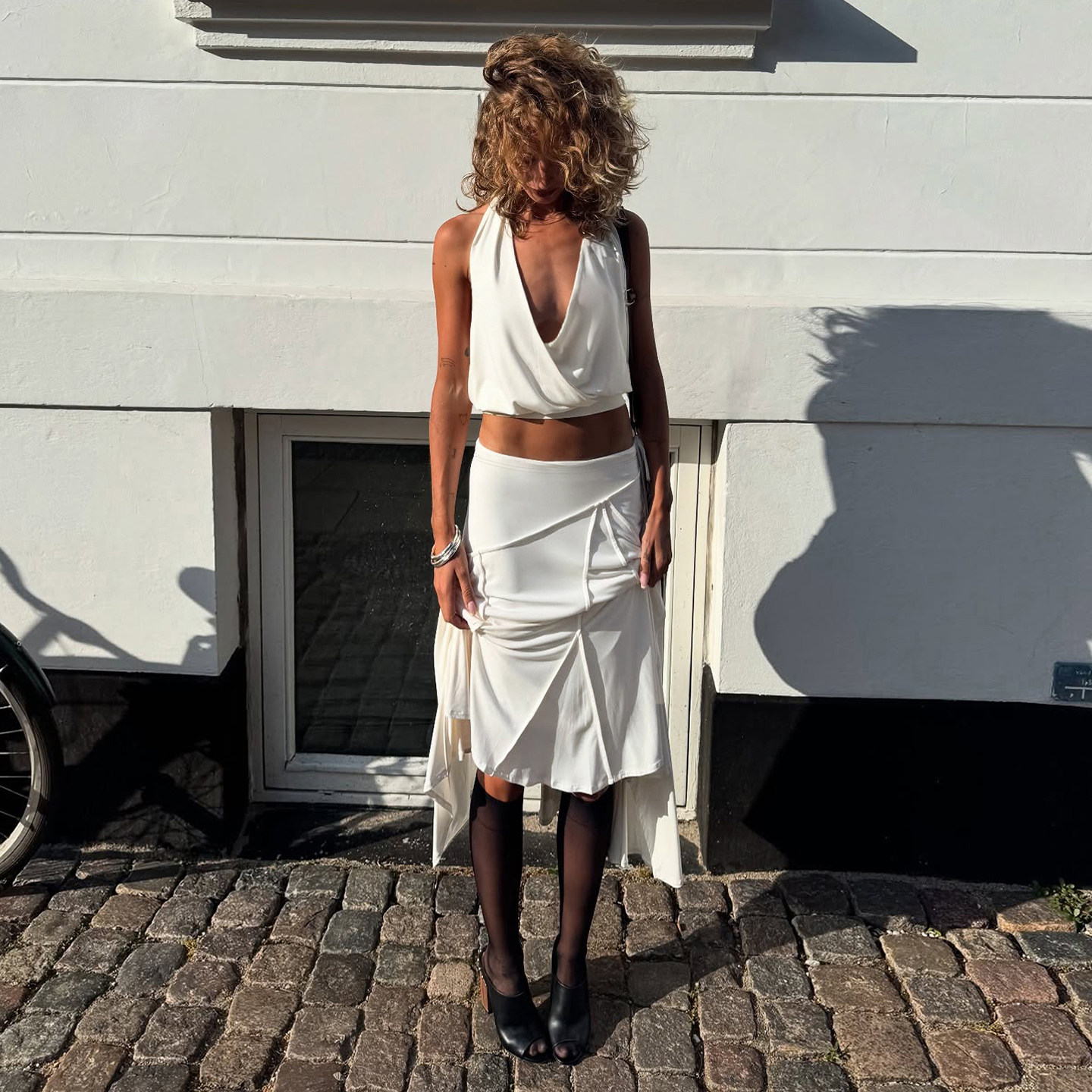 度假风 优雅休闲白色分割线设计半身裙不规则长裙 法式 ROCKMORE