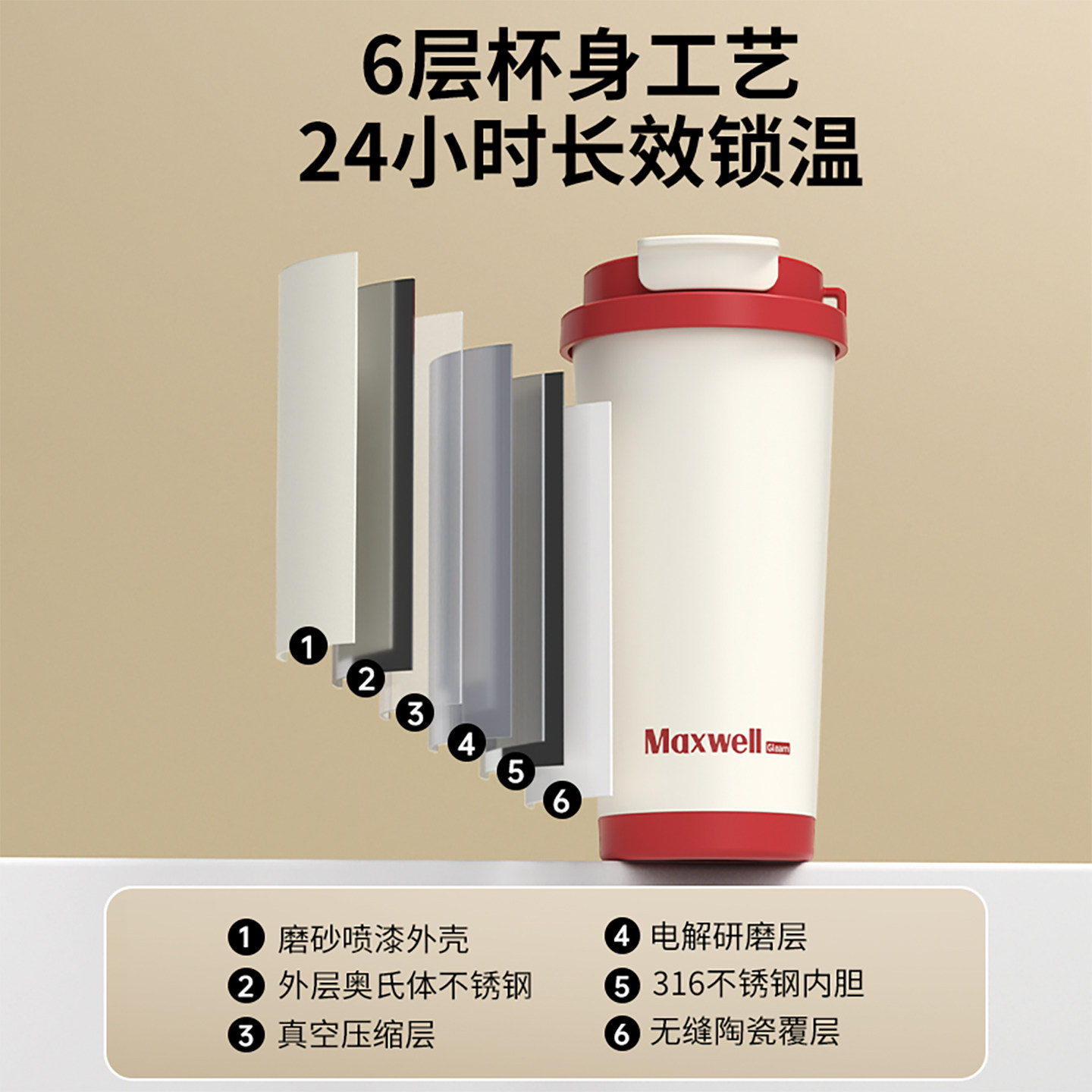 随行杯 Maxwell陶瓷咖啡保温杯陶瓷316不锈钢双饮吸管大容量便携式